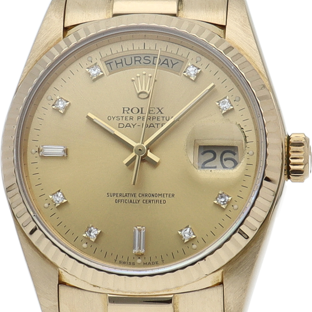 ロレックスのドレスウォッチの最高峰「デイデイト」。イエローゴールドを贅沢に使用した高級感溢れるステータスウォッチです。