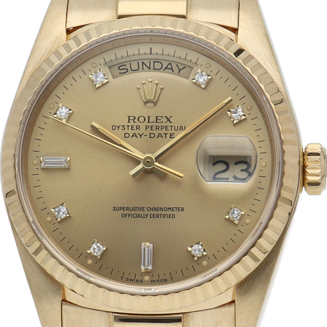 ロレックスのドレスウォッチの最高峰「デイデイト」。イエローゴールドを贅沢に使用した高級感溢れるステータスウォッチです。
