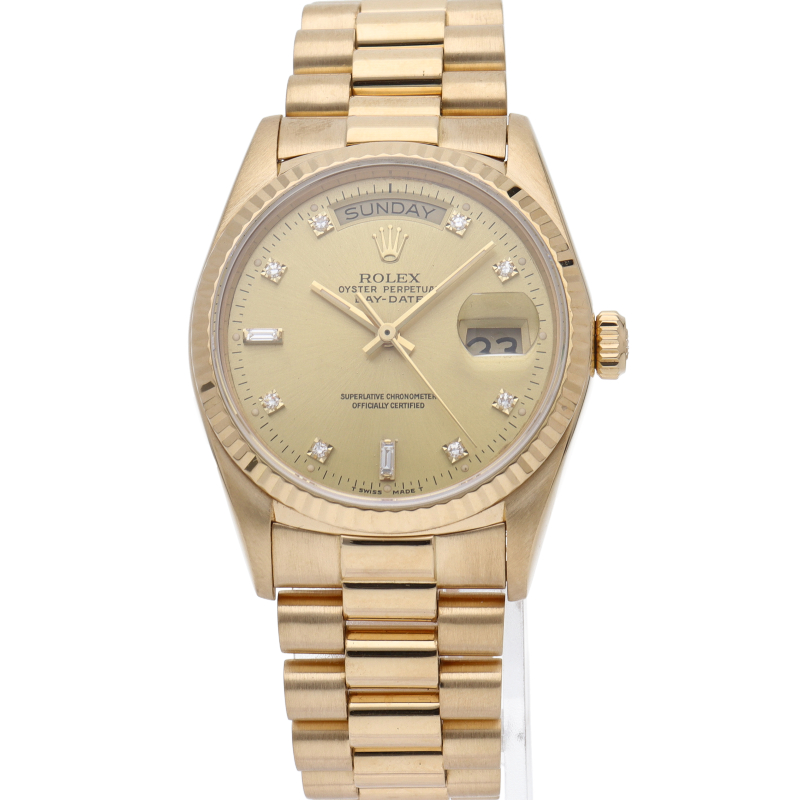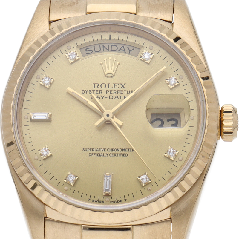 ロレックスのドレスウォッチの最高峰「デイデイト」。イエローゴールドを贅沢に使用した高級感溢れるステータスウォッチです。