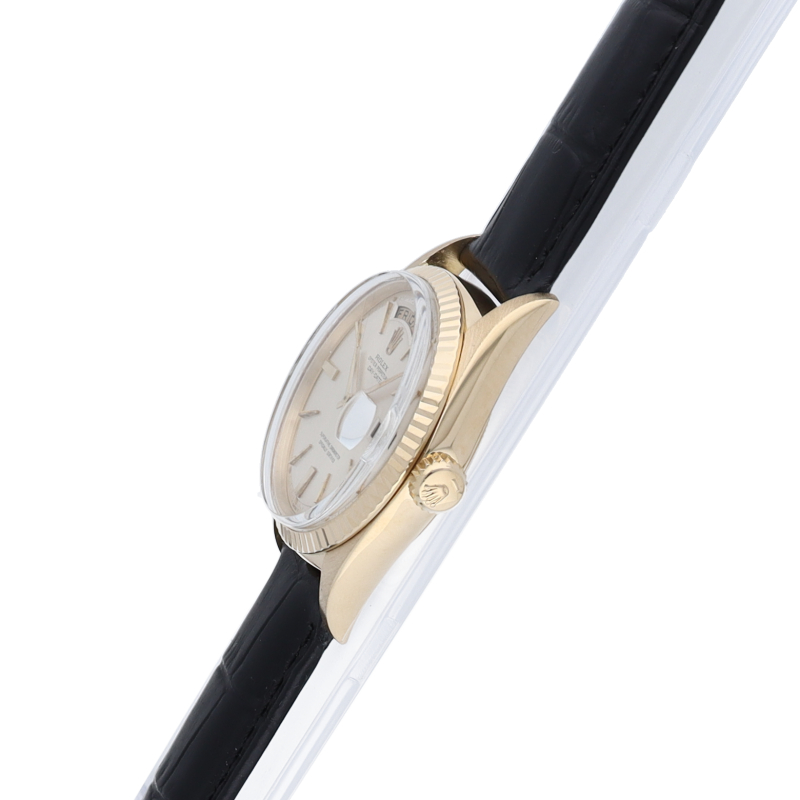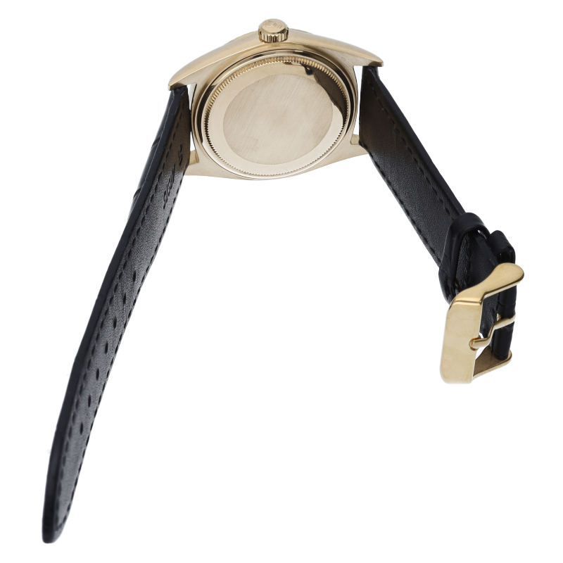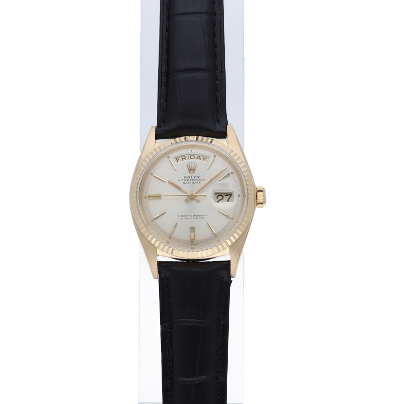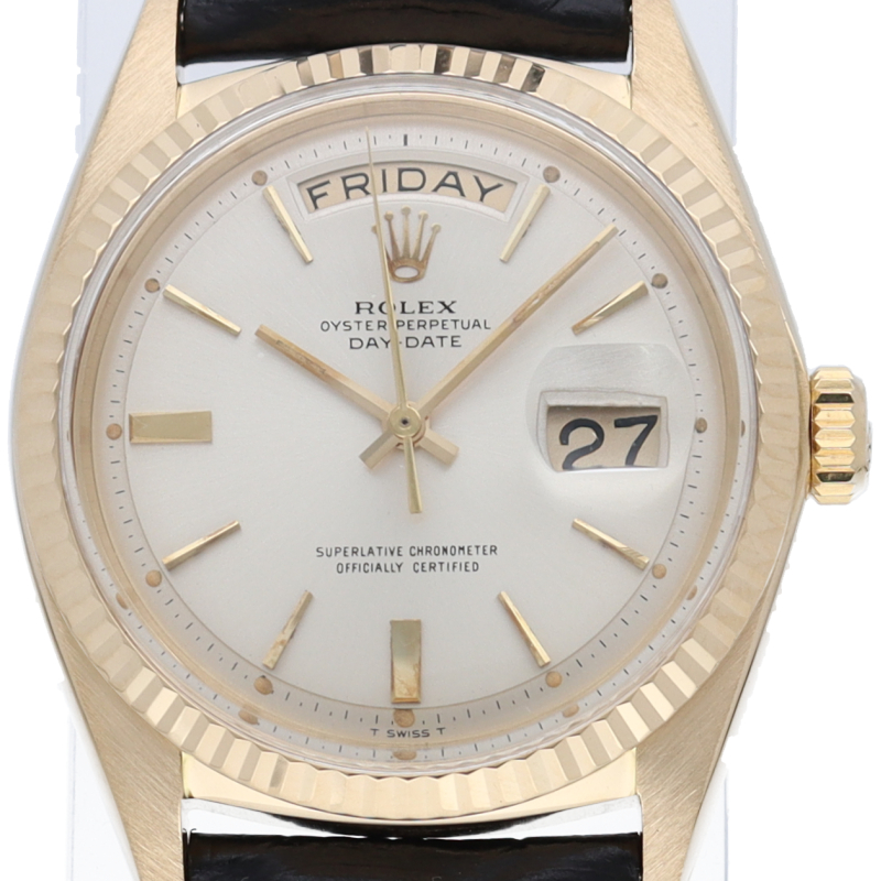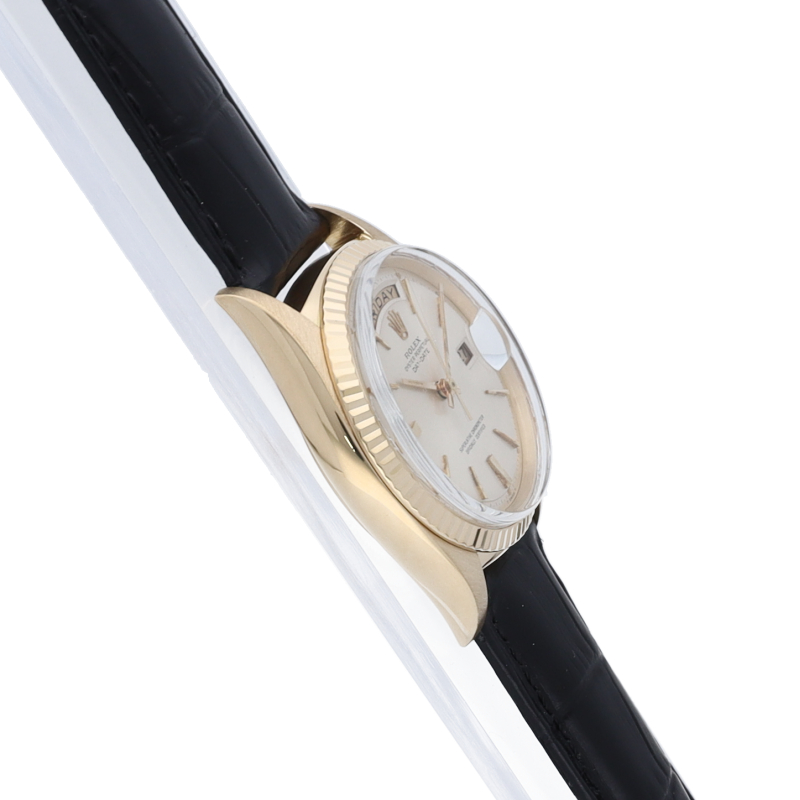 ロレックスのドレスウォッチの最高峰「デイデイト」。イエローゴールドを贅沢に使用した高級感溢れるステータスウォッチです。6時と9時に太いインデックスが配された通称ドアストッパー文字盤です。