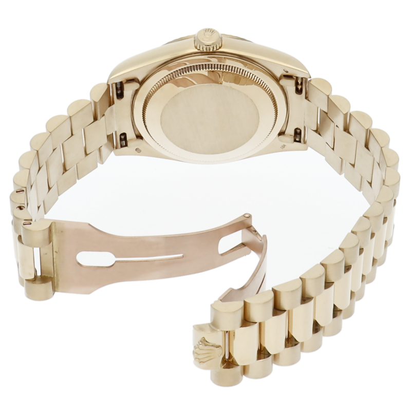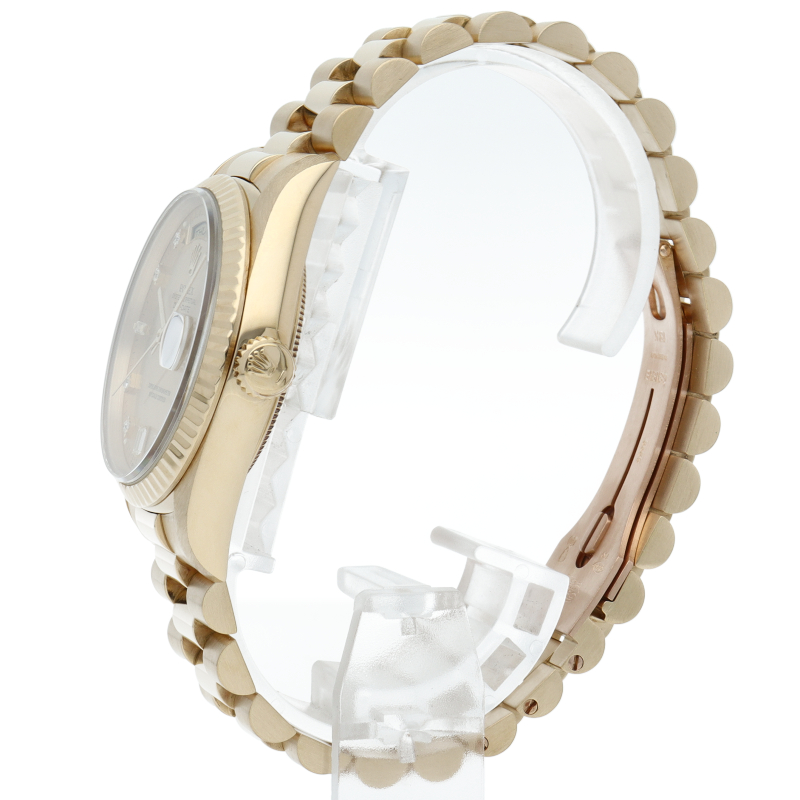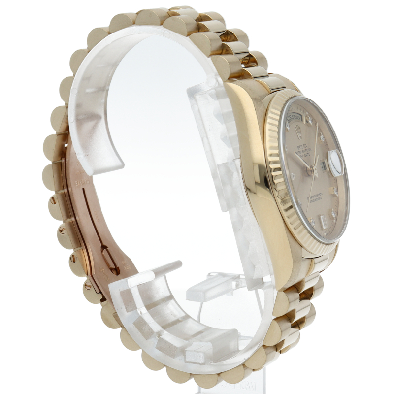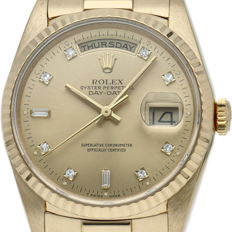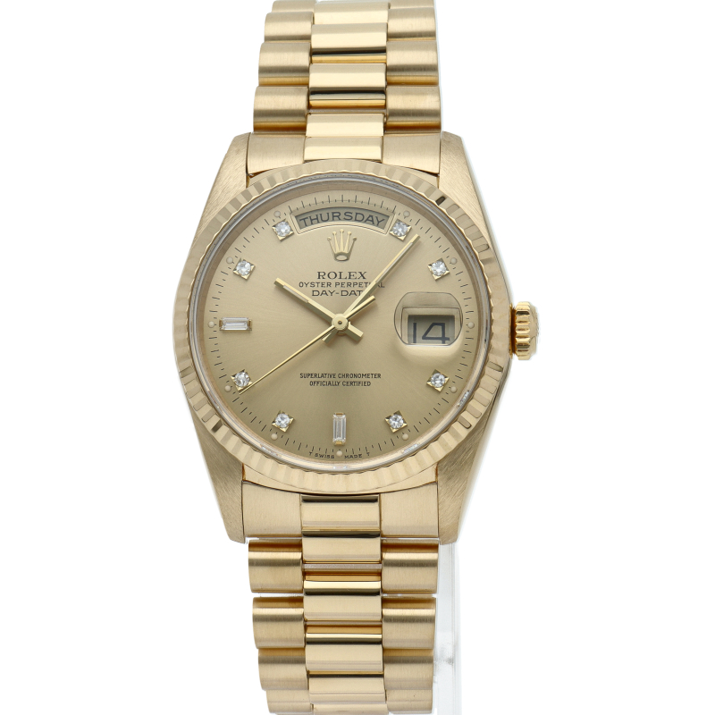 ロレックスのドレスウォッチの最高峰「デイデイト」。イエローゴールドを贅沢に使用した高級感溢れるステータスウォッチです。文字盤には10Pダイヤが施されております。