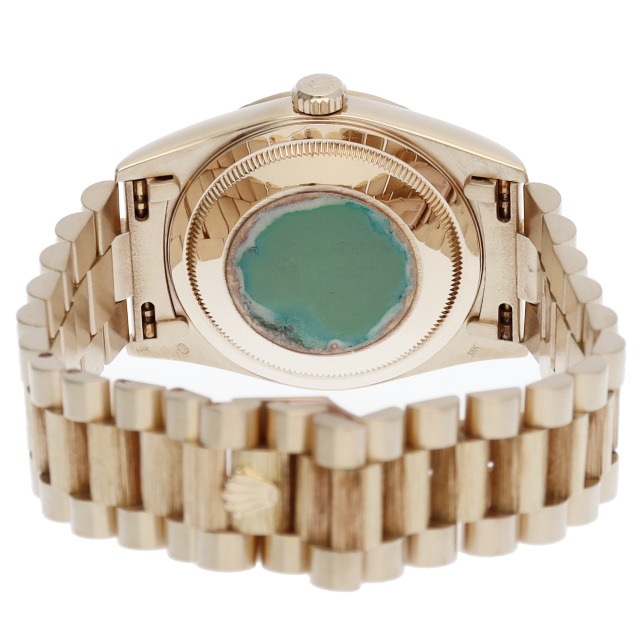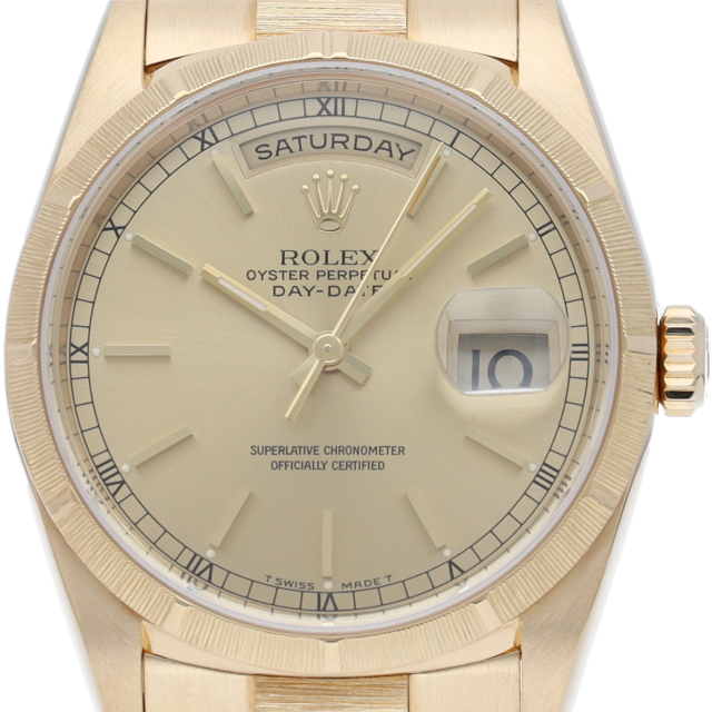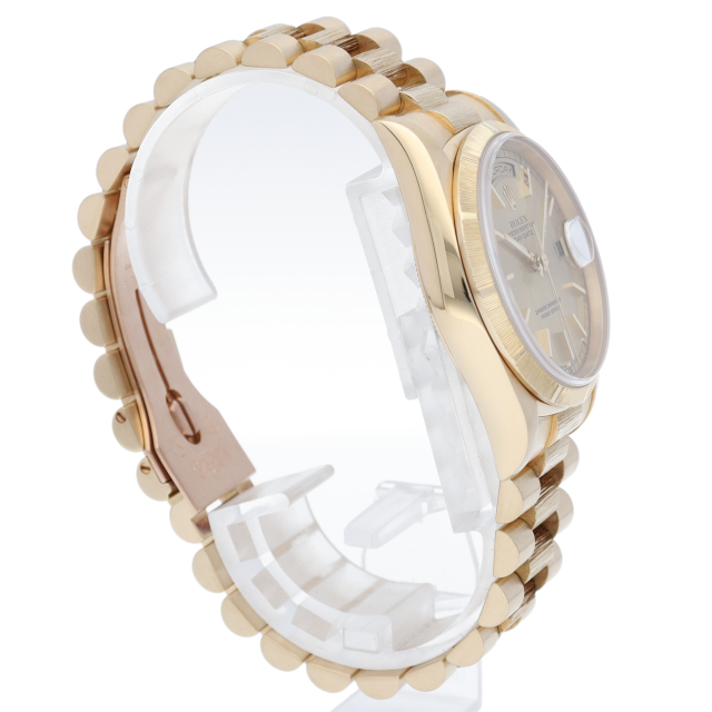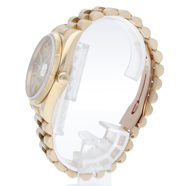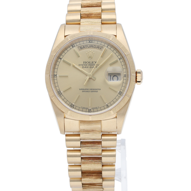 ロレックスのドレスウォッチの最高峰「デイデイト」。イエローゴールドを贅沢に使用した高級感溢れるステータスウォッチです。こちらは貴重なバーク仕上げとなっております。