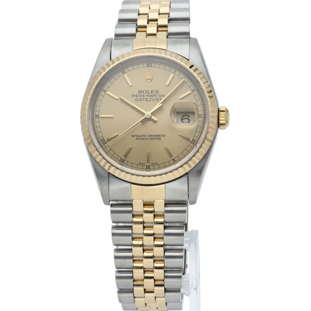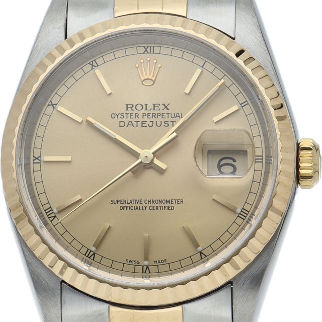 ロレックスのドレスウォッチで幅広い年齢層に愛されている「デイトジャスト」。イエローゴールドを全体に使用した高級感溢れるステータスウォッチです。