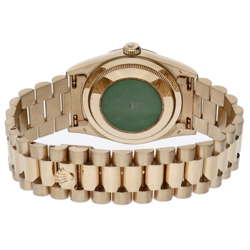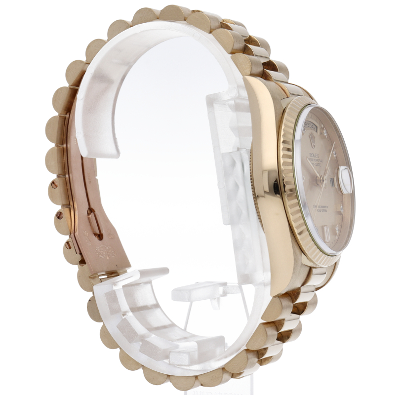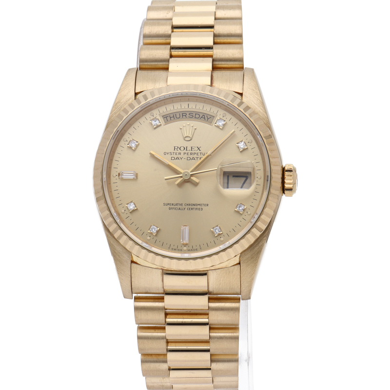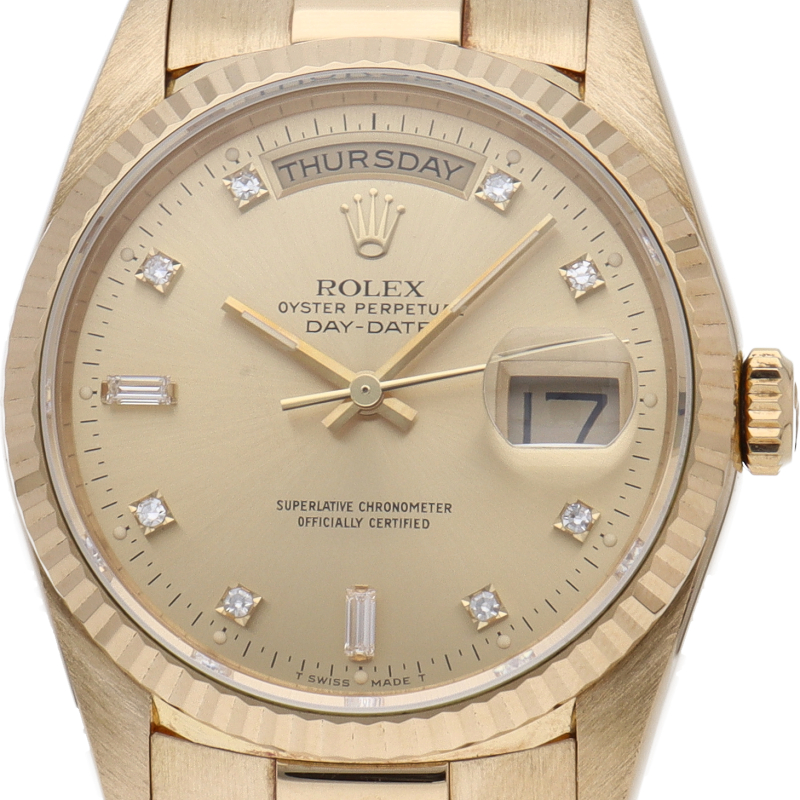 ロレックスのドレスウォッチの最高峰「デイデイト」。イエローゴールドを贅沢に使用した高級感溢れるステータスウォッチです。文字盤には10Pダイヤ付。