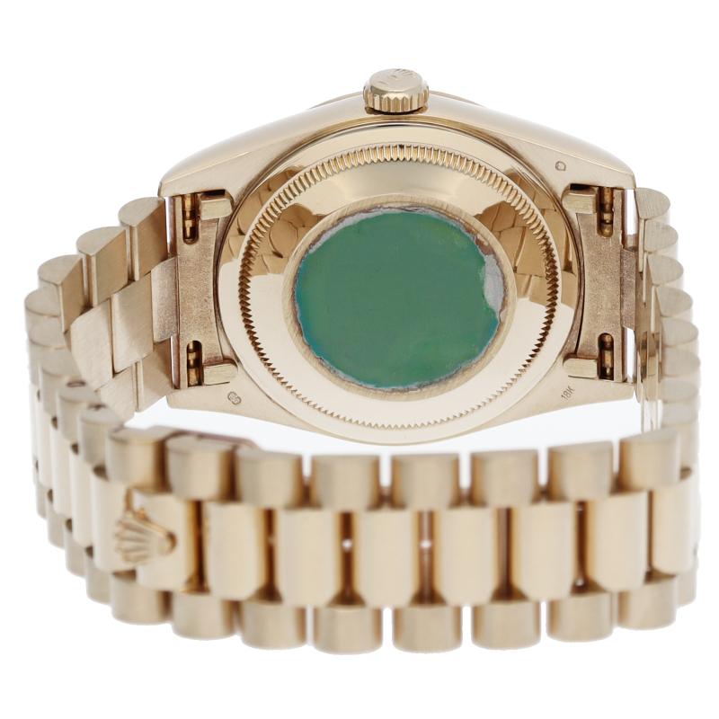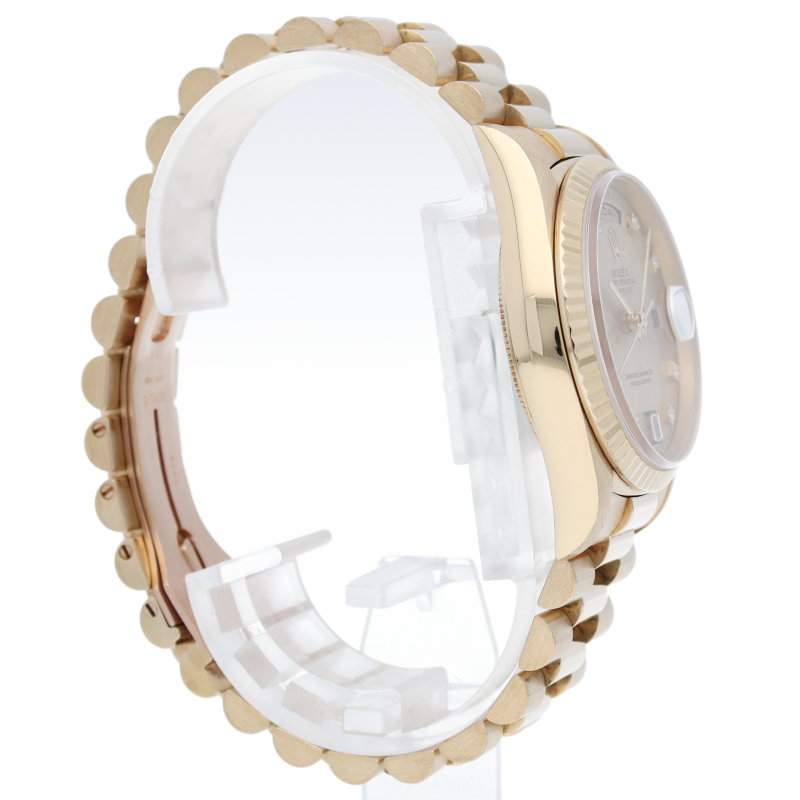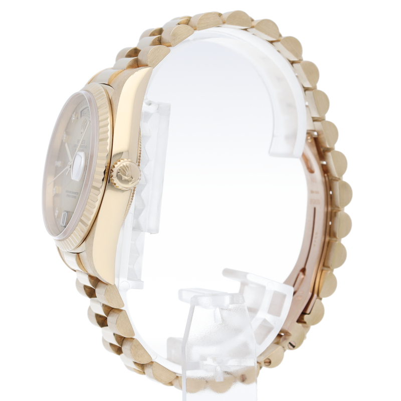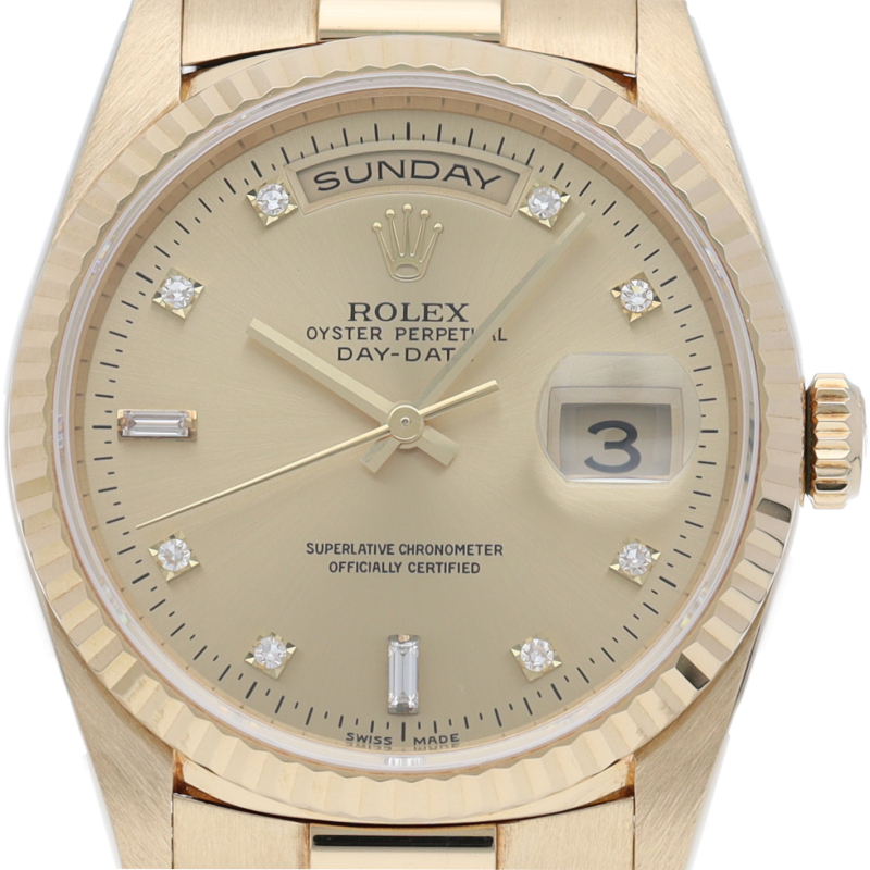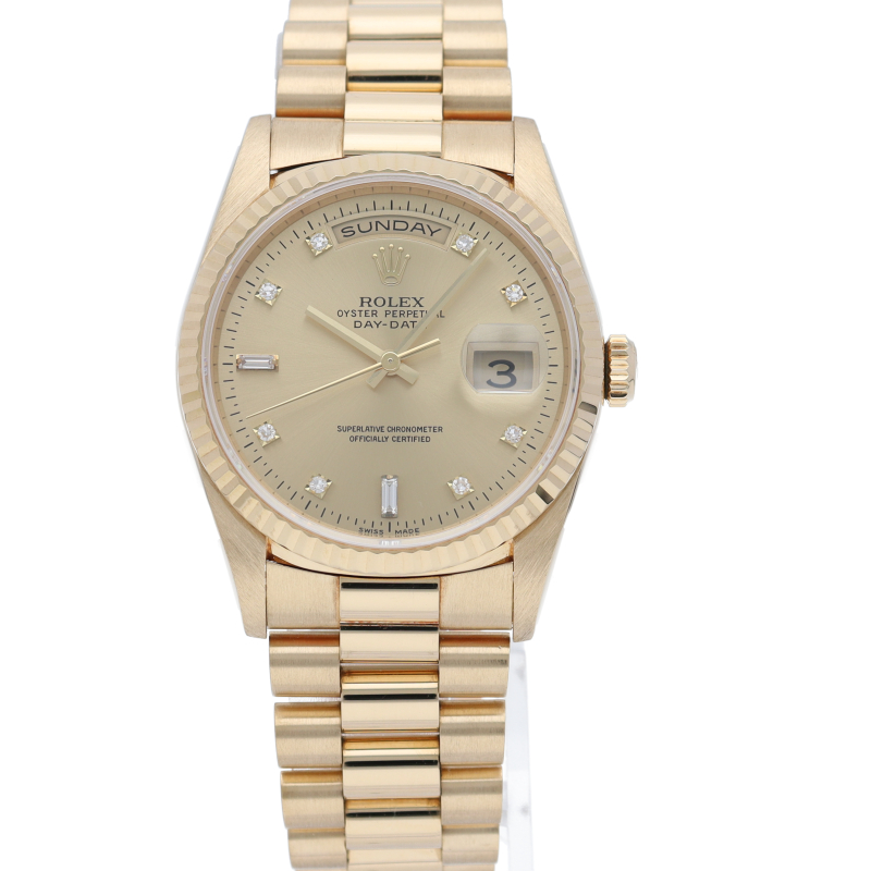 ロレックスのドレスウォッチの最高峰「デイデイト」。イエローゴールドを贅沢に使用した高級感溢れるステータスウォッチです。文字盤には10Pダイヤ付。