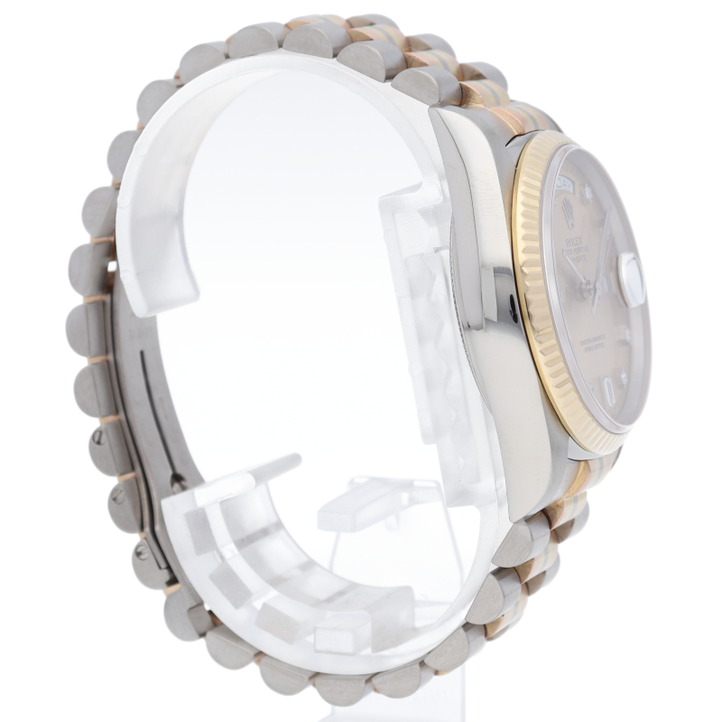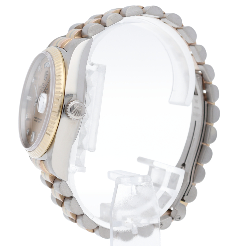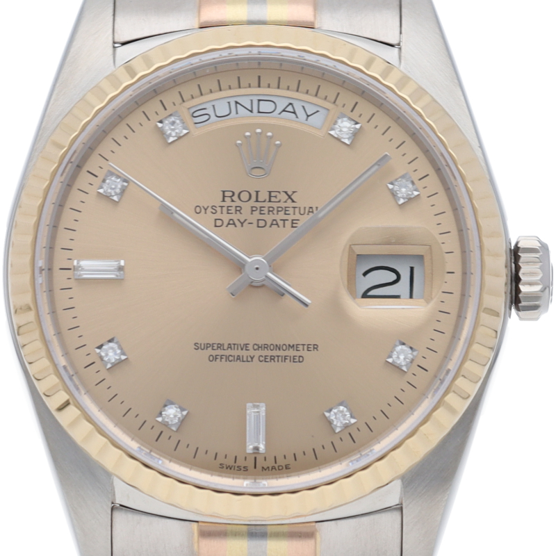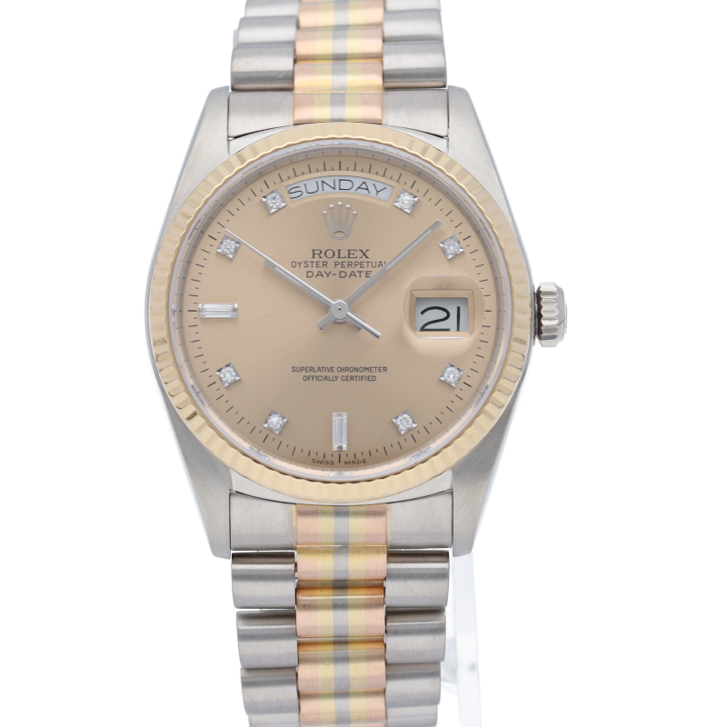 ロレックスのドレスウォッチの最高峰「デイデイト」。更に、既に生産が終了となり玉数がかなり減少しているトリドールブレスタイプは色鮮やかで希少です。