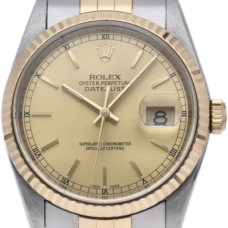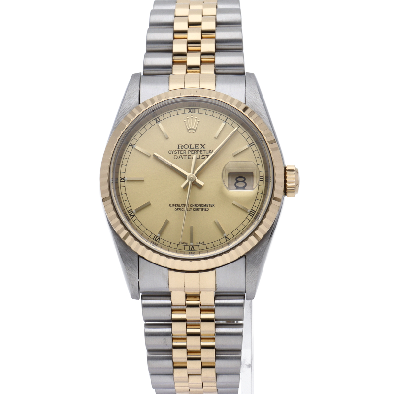 ロレックスのドレスウォッチで幅広い年齢層に愛されている「デイトジャスト」。イエローゴールドを全体に使用した高級感溢れるステータスウォッチです。
