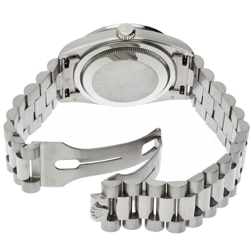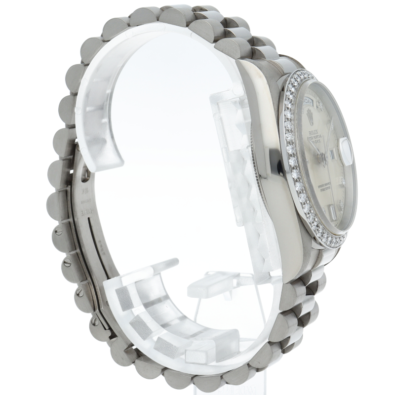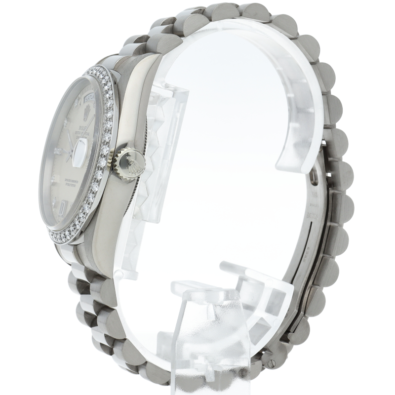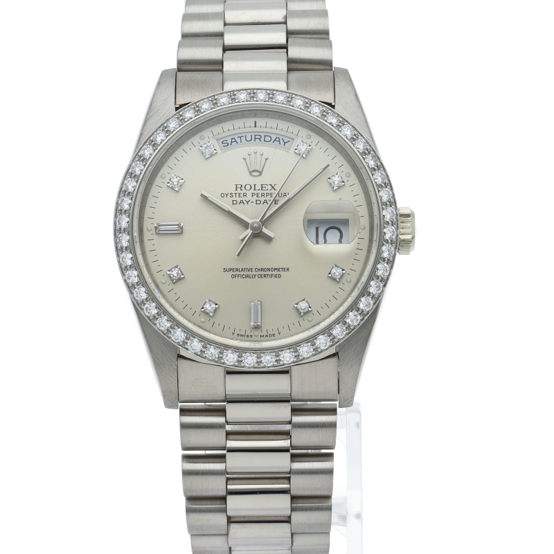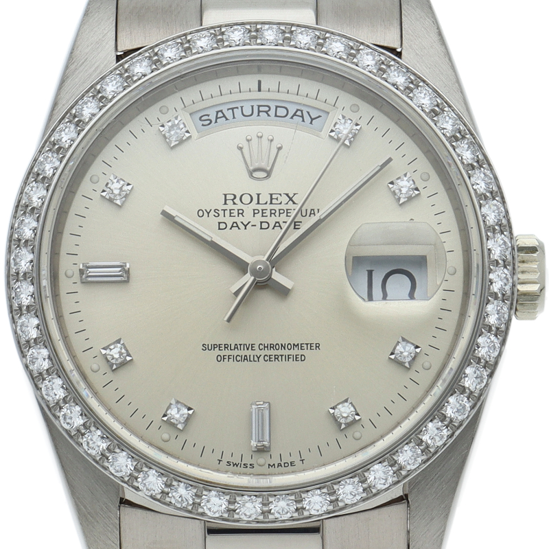 ロレックスのドレスウォッチの最高峰「デイデイト」。ホワイトゴールドを贅沢に使用した高級感溢れるステータスウォッチです。ベゼルにもダイヤモンドが施された最高級品です。