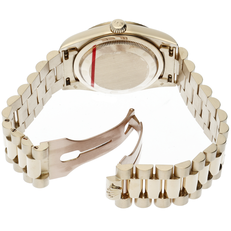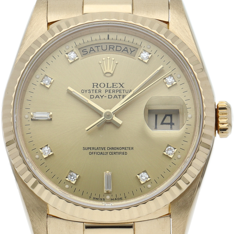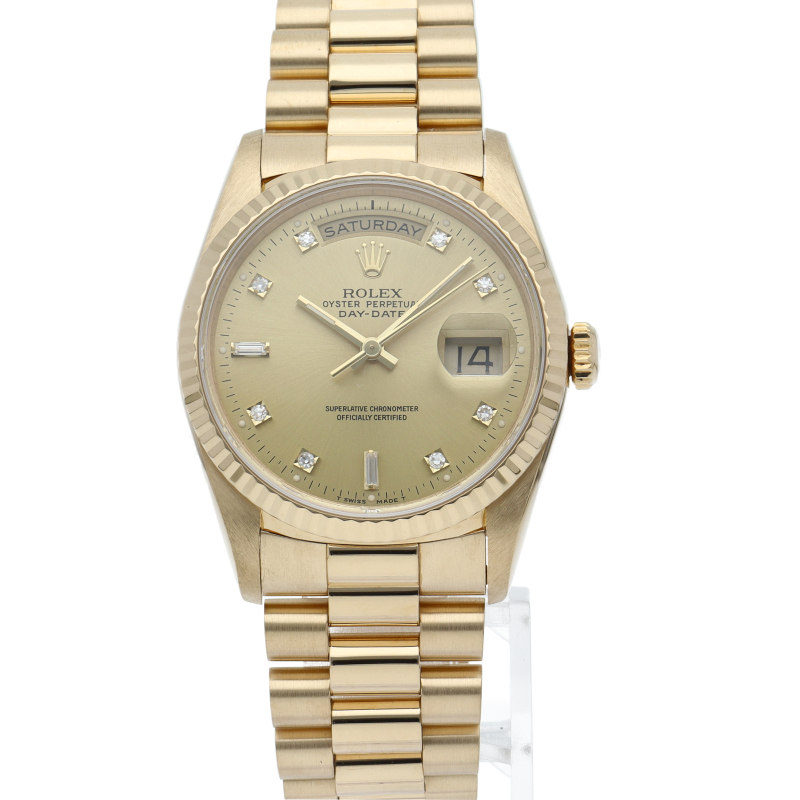 ロレックスのドレスウォッチの最高峰「デイデイト」。イエローゴールドを贅沢に使用した高級感溢れるステータスウォッチです。文字盤には10Pダイヤが施されております。