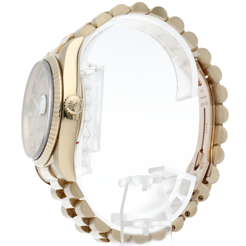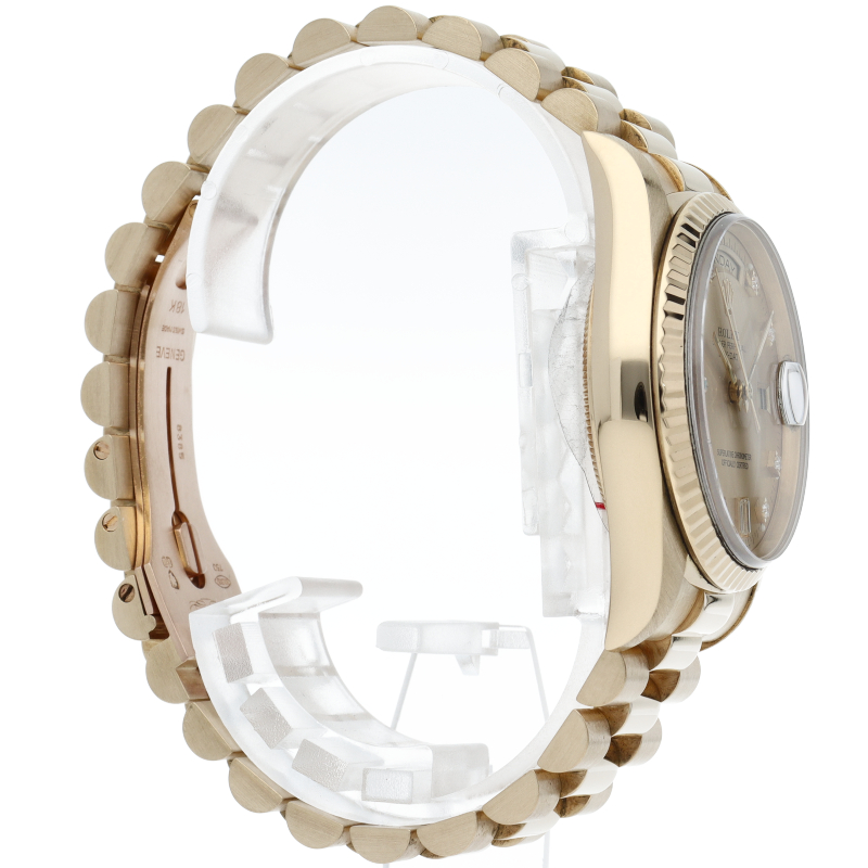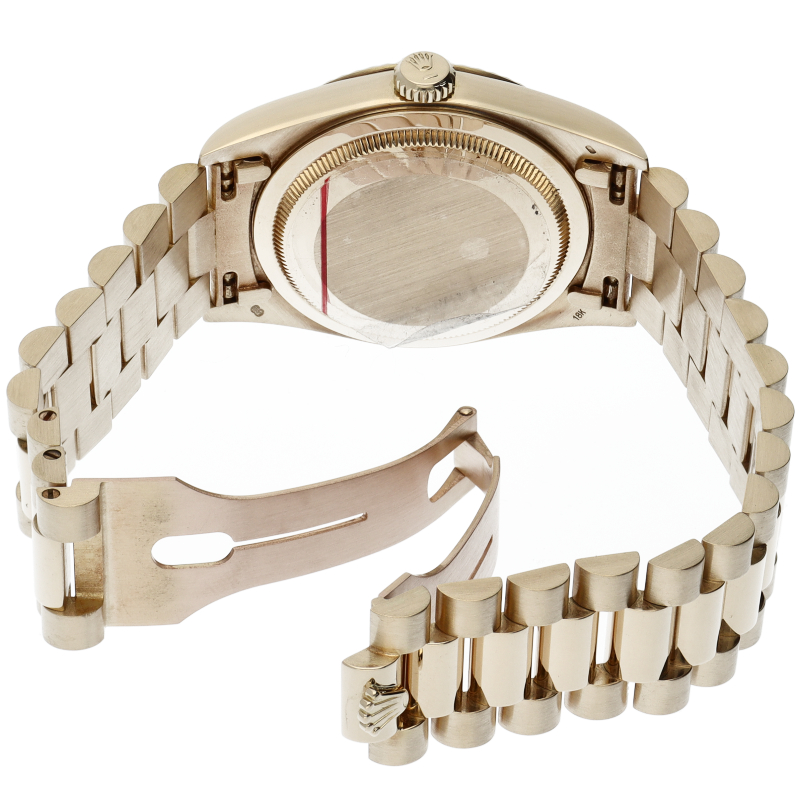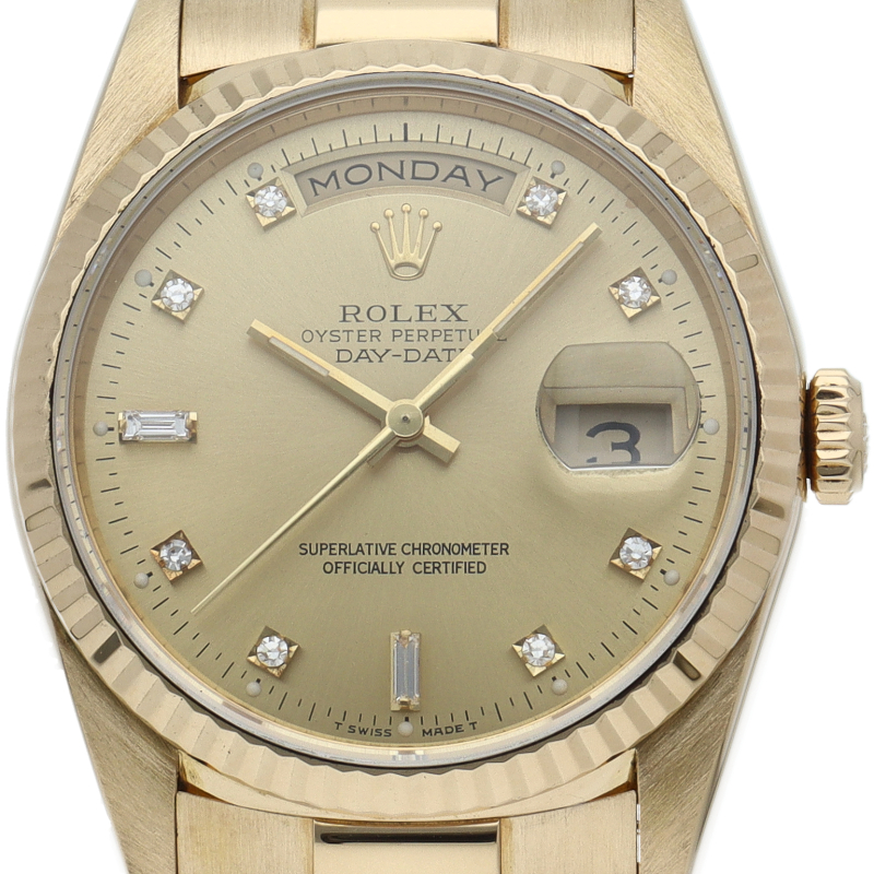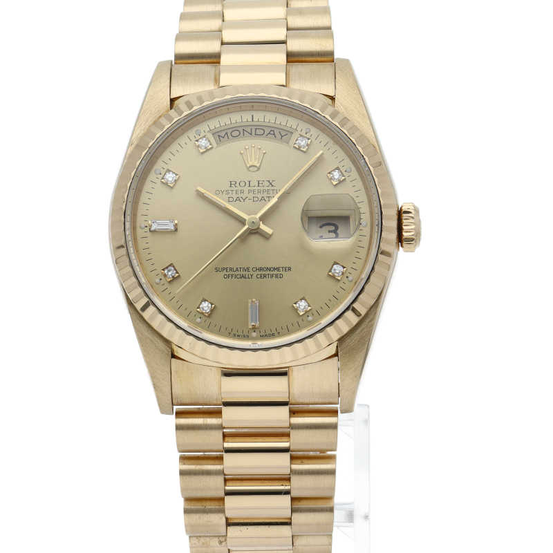 ロレックスのドレスウォッチの最高峰「デイデイト」。イエローゴールドを贅沢に使用した高級感溢れるステータスウォッチです。文字盤には10Pダイヤが施されております。