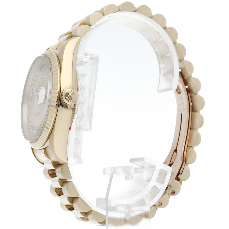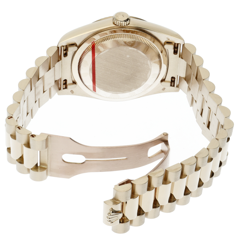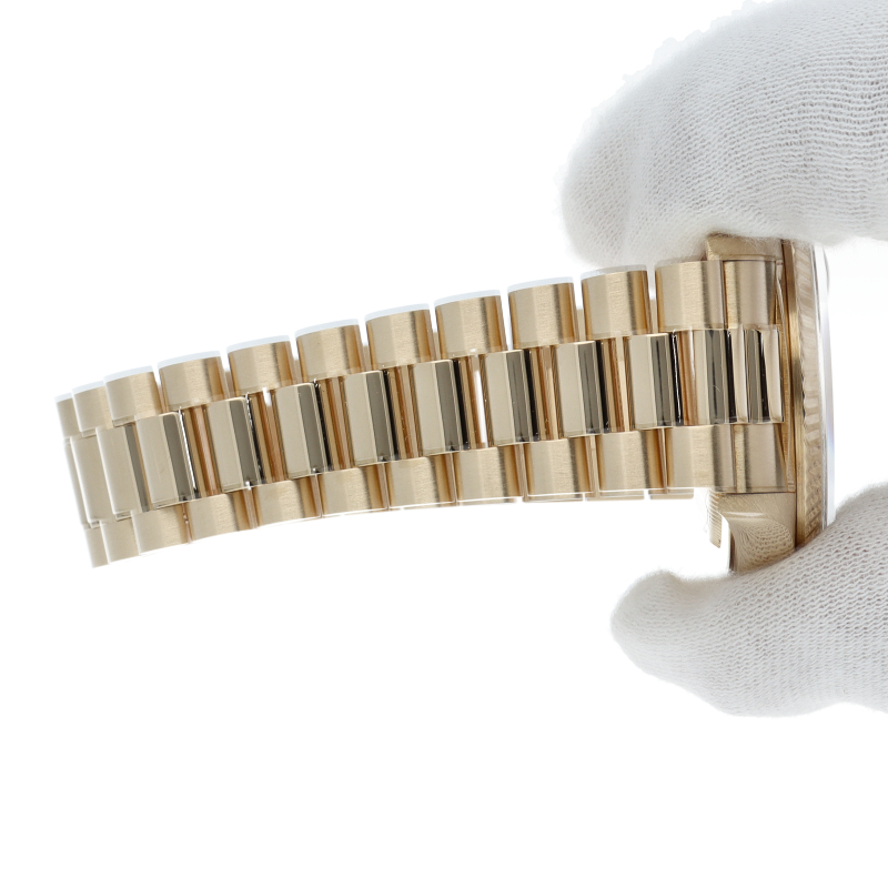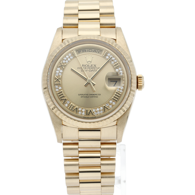 ロレックスのドレスウォッチの最高峰「デイデイト」。イエローゴールドを贅沢に使用した高級感溢れるステータスウォッチです。文字盤にはサークルダイヤ付。