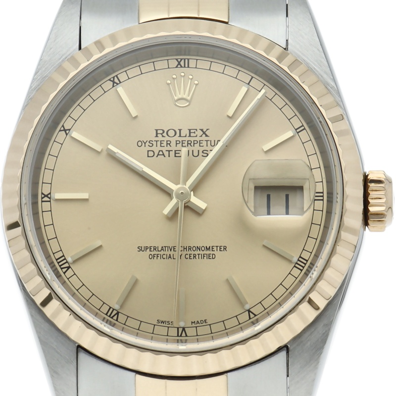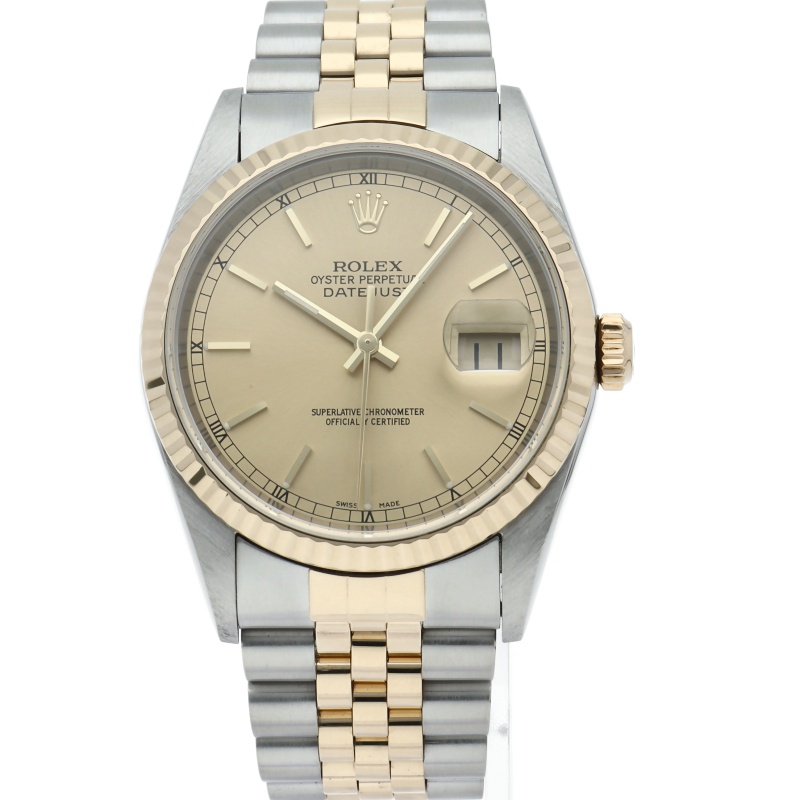 ロレックスのドレスウォッチで幅広い年齢層に愛されている「デイトジャスト」。イエローゴールドを全体に使用した高級感溢れるステータスウォッチです。