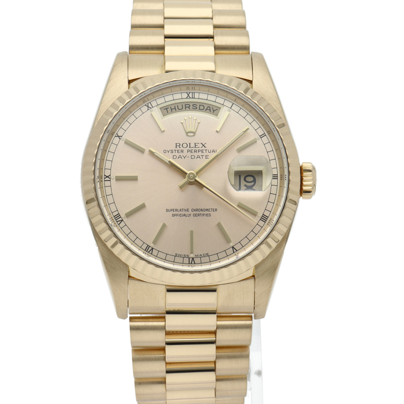 ロレックスのドレスウォッチの最高峰「デイデイト」。イエローゴールドを贅沢に使用した高級感溢れるステータスウォッチです。