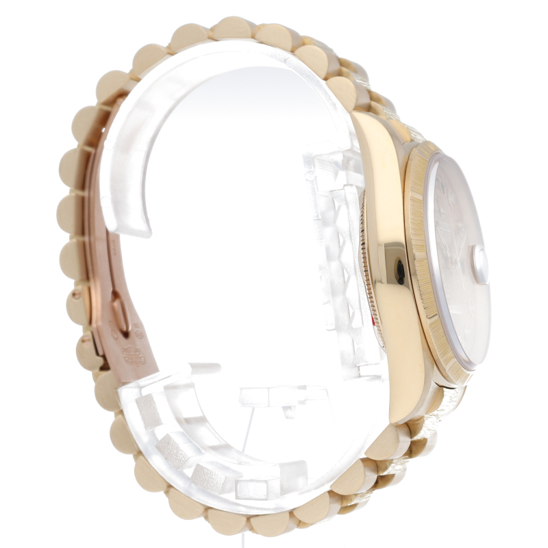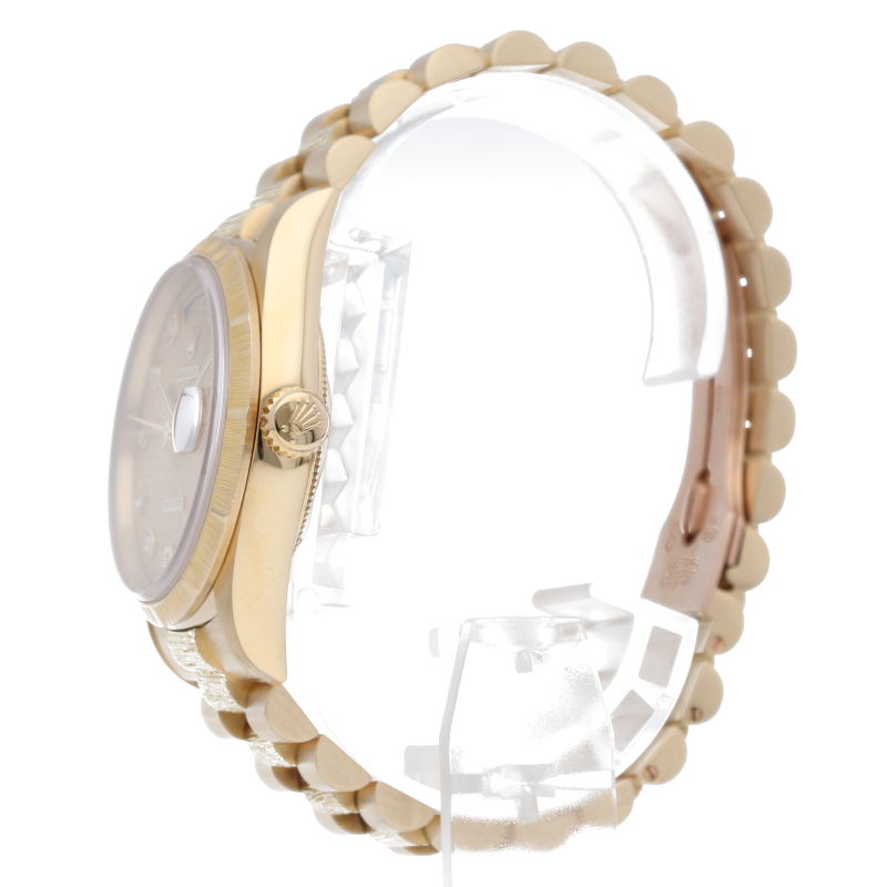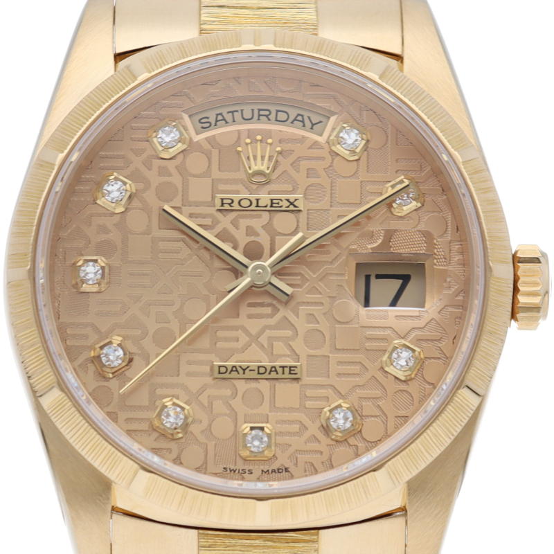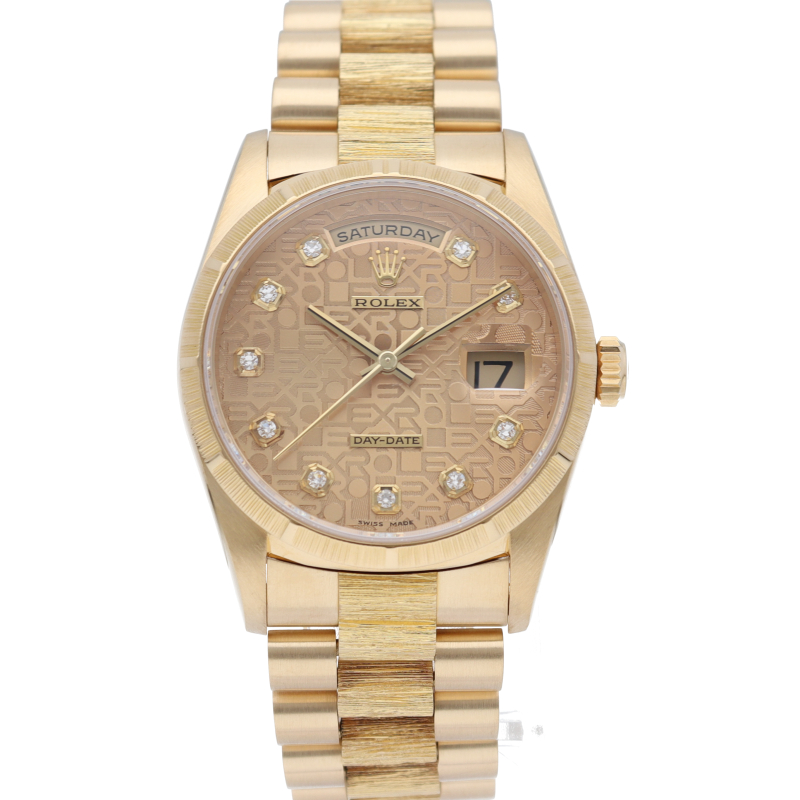 ロレックスのドレスウォッチの最高峰「デイデイト」。イエローゴールドを贅沢に使用した高級感溢れるステータスウォッチです。こちらは貴重なバーク仕上げとなっております。