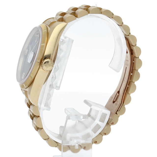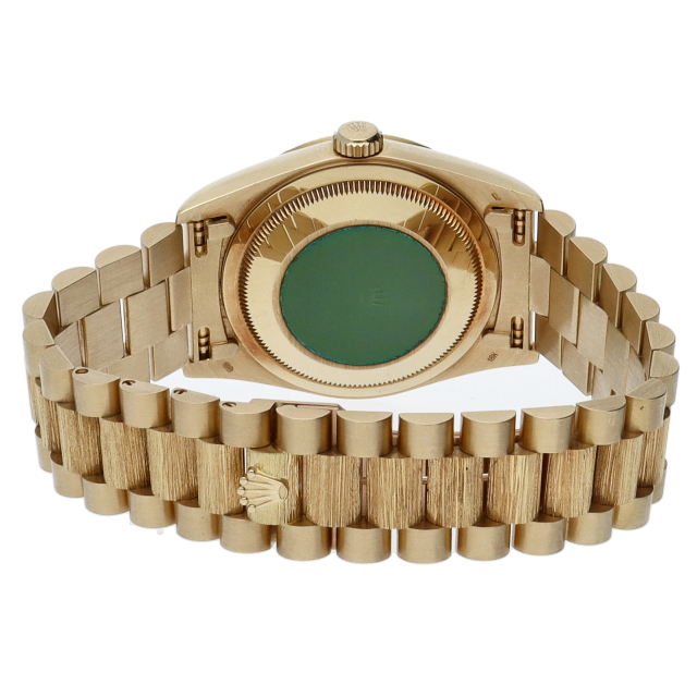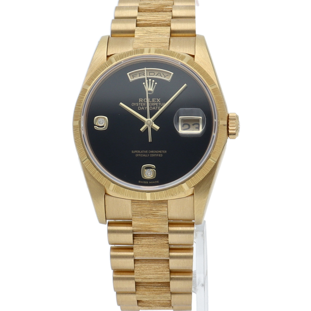ロレックスのドレスウォッチの最高峰「デイデイト」。イエローゴールドを贅沢に使用した高級感溢れるステータスウォッチです。こちらは貴重なバーク仕上げとなっております。