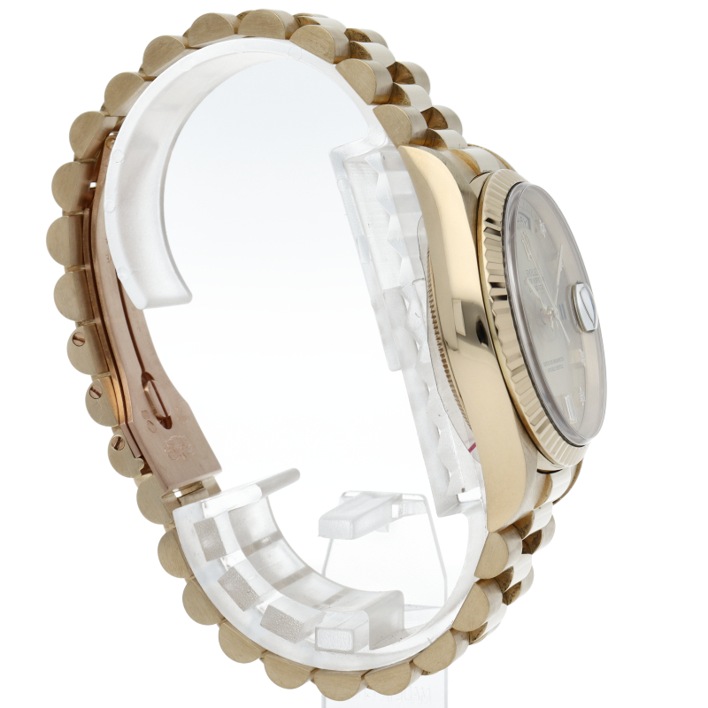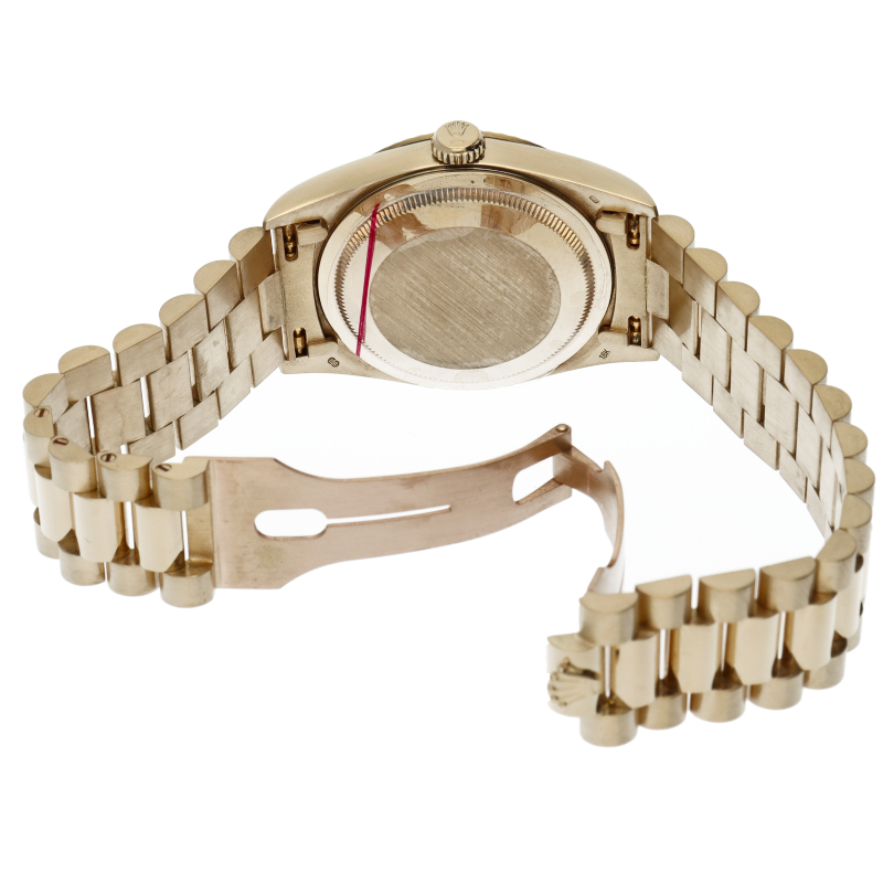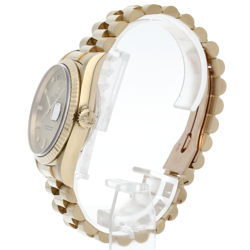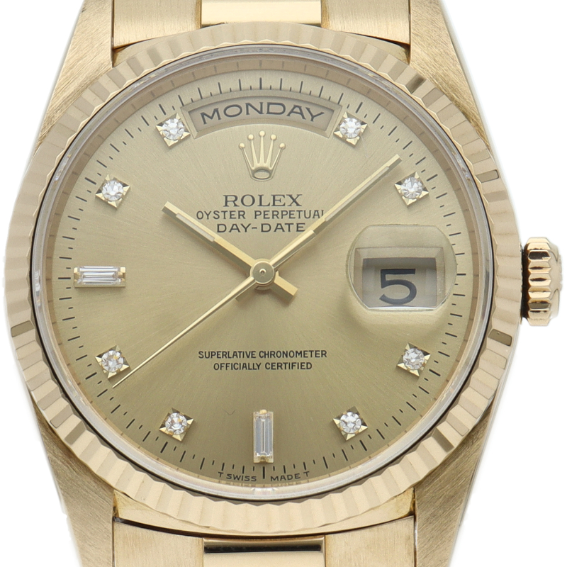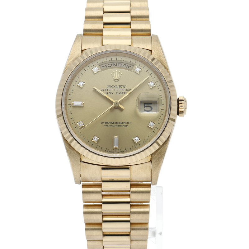 ロレックスのドレスウォッチの最高峰「デイデイト」。イエローゴールドを贅沢に使用した高級感溢れるステータスウォッチです。文字盤には10Pダイヤ付。