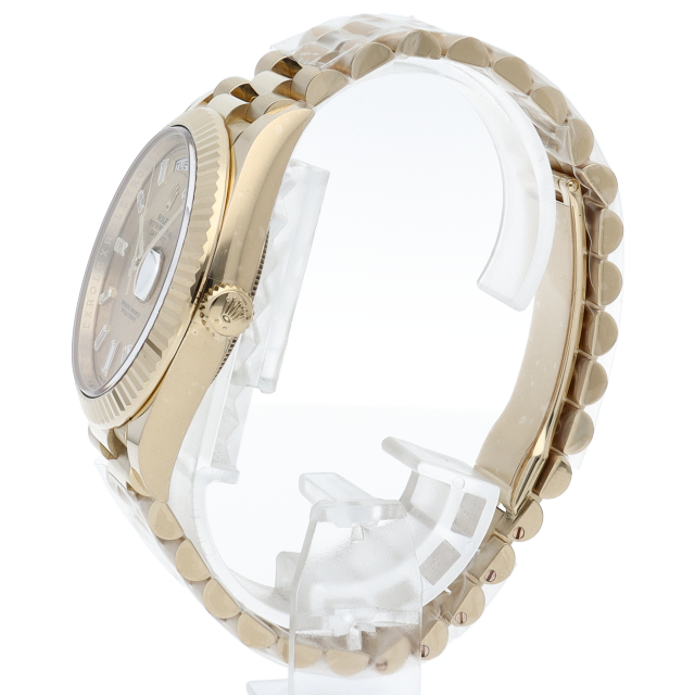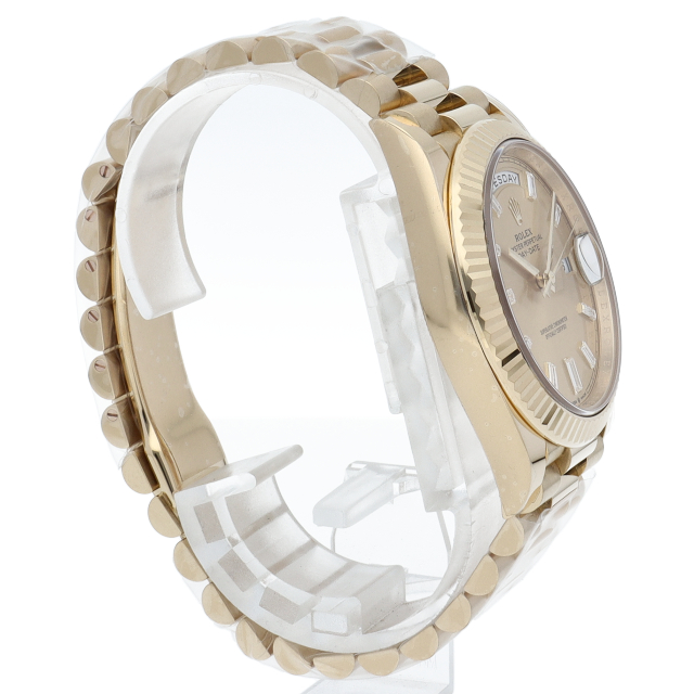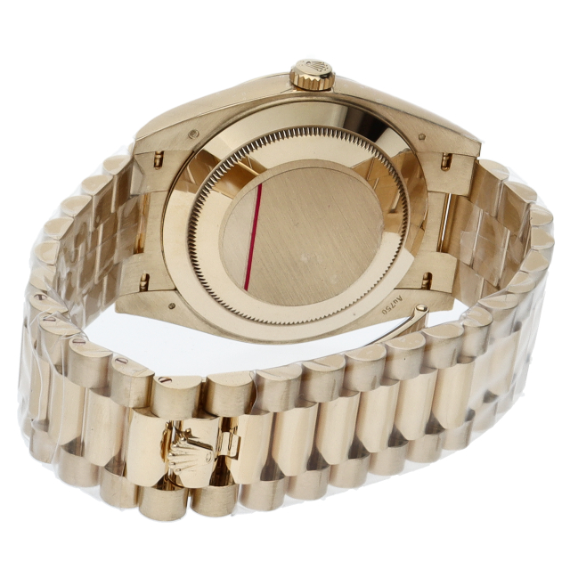 2015年に発売し、サイズアップしたデイデイト40。こちらはイエローゴールドモデルとなり10ポイントバゲットダイヤインデックスを施した豪華なデザインです。搭載されている自社製キャリバー3255は、耐磁性ブルーパラクロム・ヘアスプリングと高性能パラフレックスショック・アブソーバを搭載し、その精度基準はこれまでのクロノメーターの約2倍に設定され、ケーシング後の日差は-2~+2秒で調整されています。
