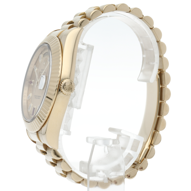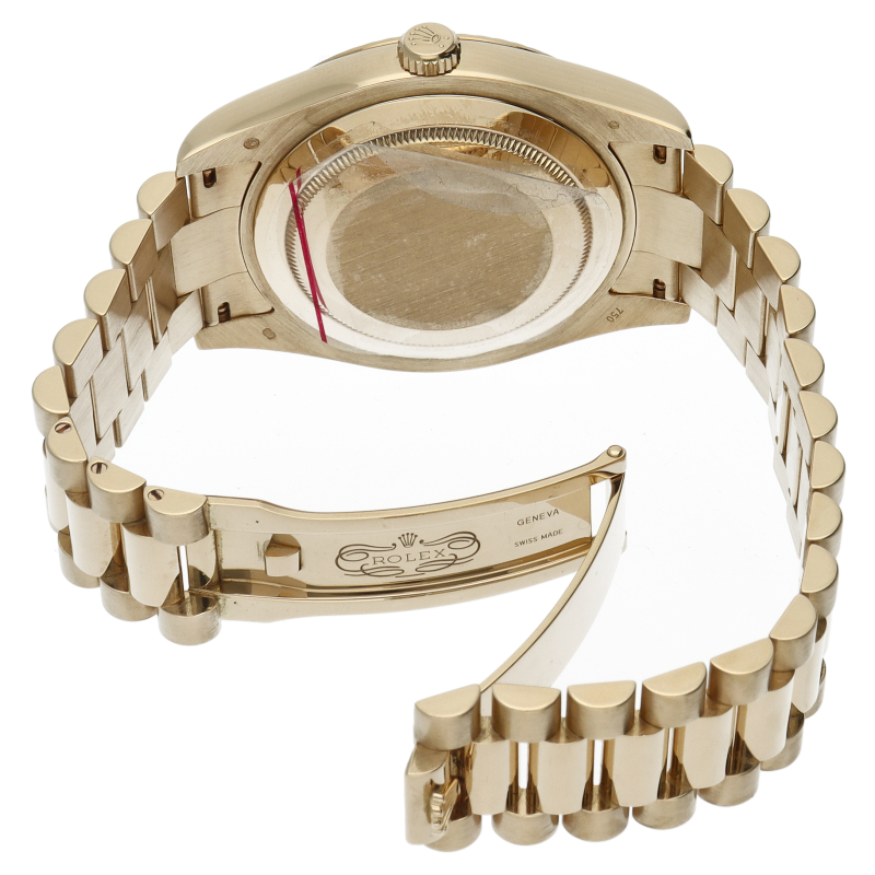 ロレックスのドレスウォッチの最高峰「デイデイト」。イエローゴールドを贅沢に使用したゴージャスさが人気の1本。ケース径が38mmから41mmへとサイズ変更され、存在感がアップしております。文字盤には8Pダイヤと2Pルビーが施されたラグジュアリーな1本です。