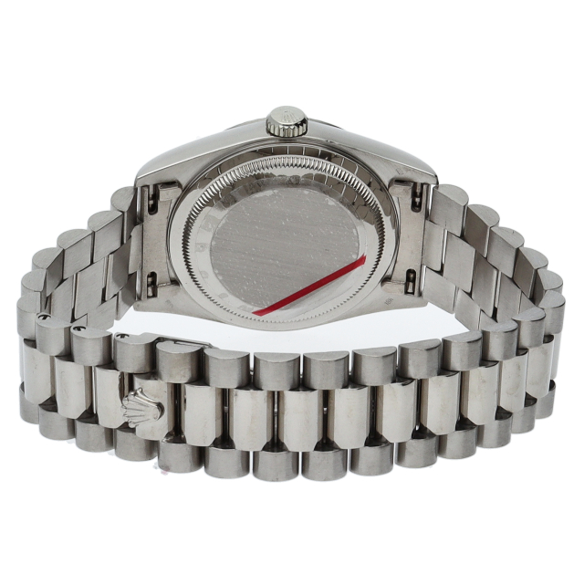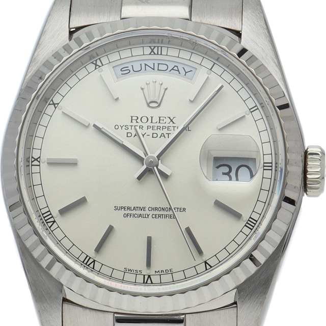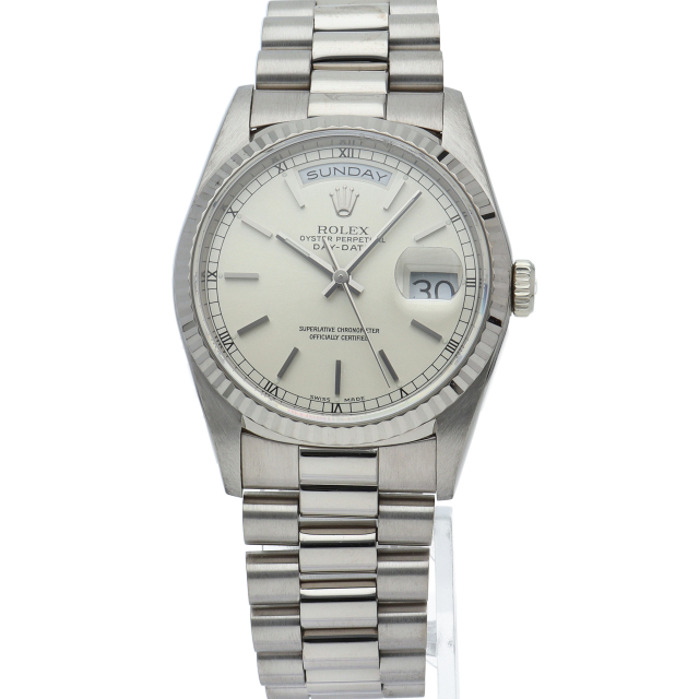ロレックスのドレスウォッチの最高峰「デイデイト」。ホワイトゴールドを贅沢に使用したゴージャスさが人気のオススメの1本です。