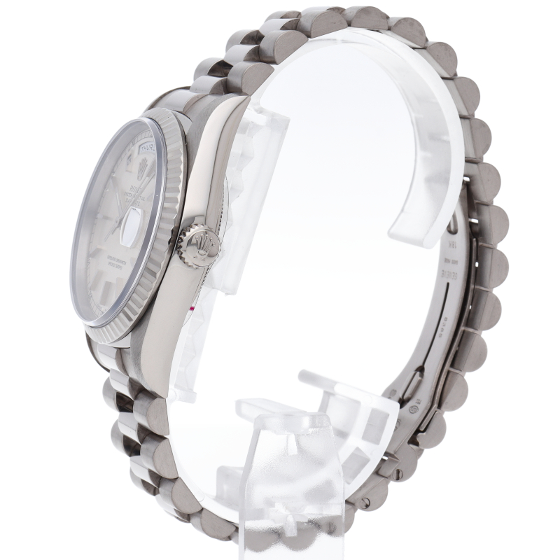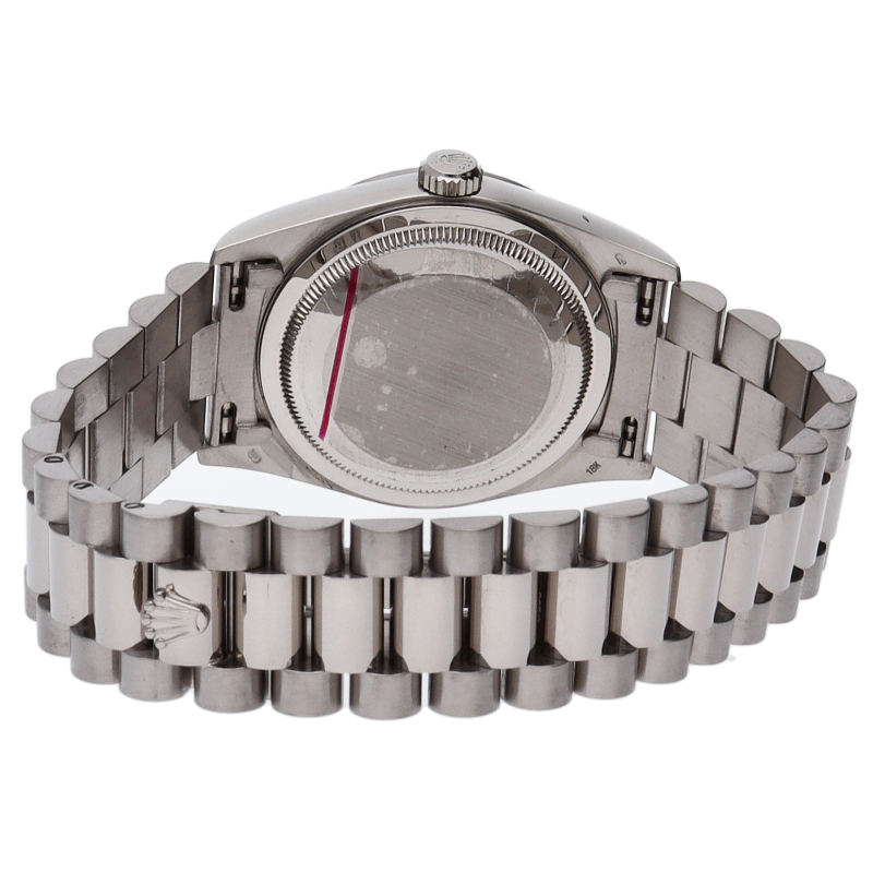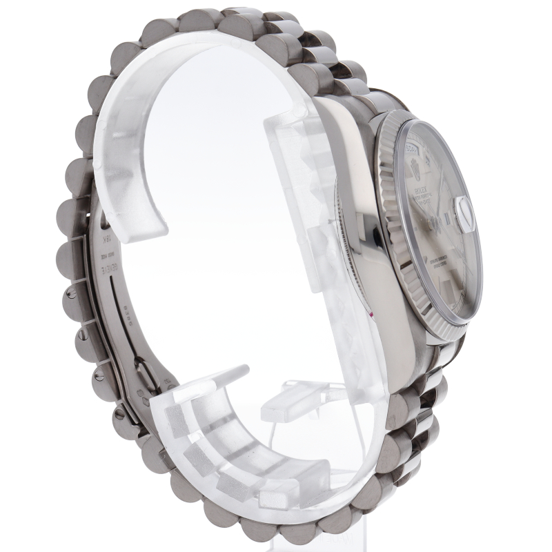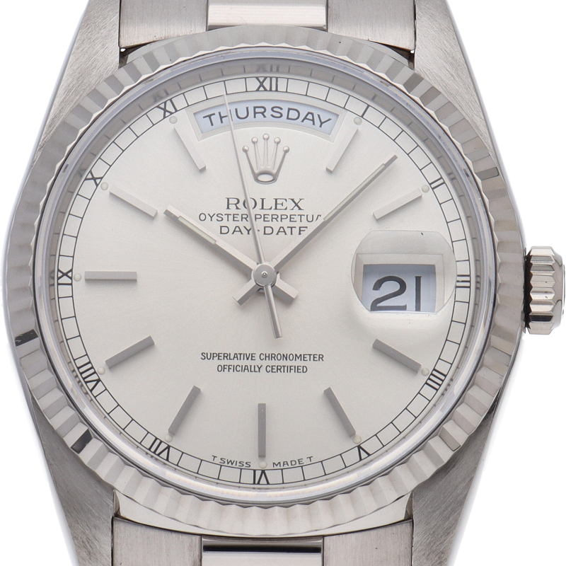 ロレックスのドレスウォッチの最高峰「デイデイト」。ホワイトゴールドを贅沢に使用したゴージャスさが人気のオススメの1本です。