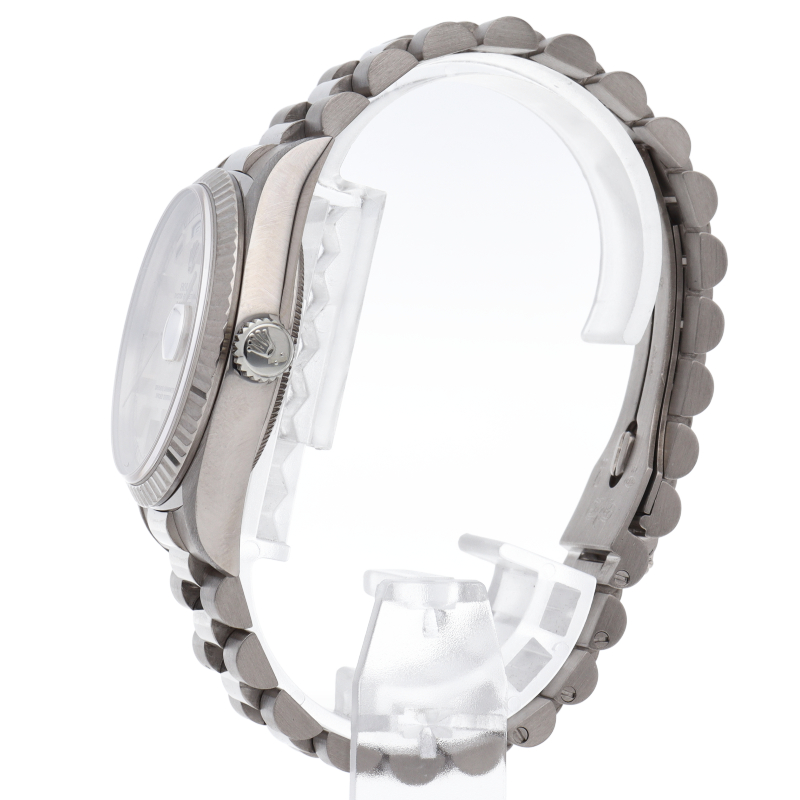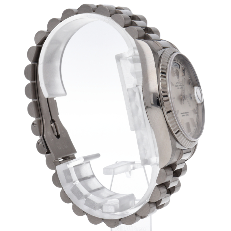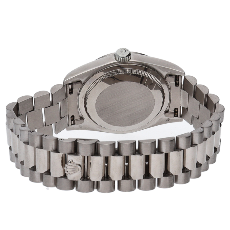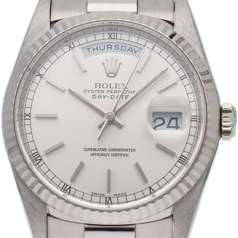ロレックスのドレスウォッチの最高峰「デイデイト」。ホワイトゴールドを贅沢に使用したゴージャスさが人気のオススメの1本です。