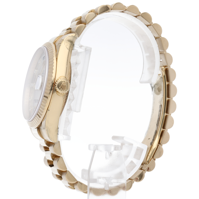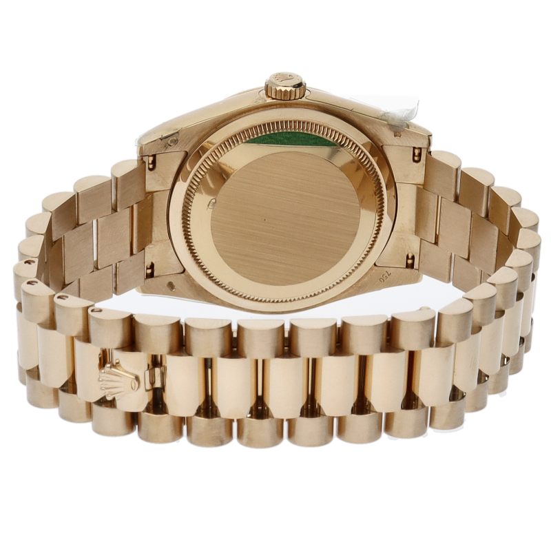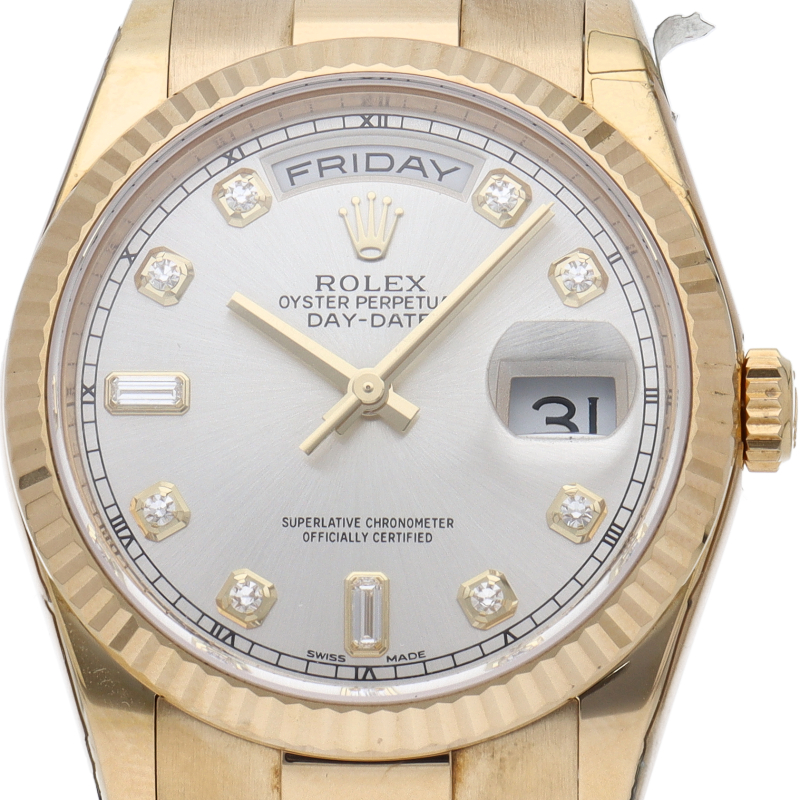 ロレックスのドレスウォッチの最高峰「デイデイト」。イエローゴールドを贅沢に使用したゴージャスさが人気の1本。10Pダイヤモンド仕様。