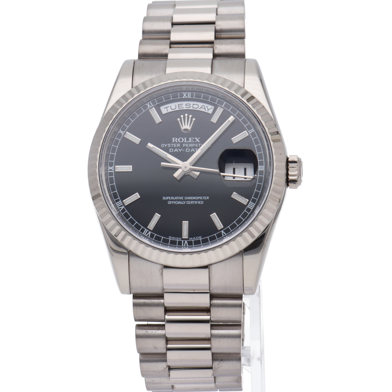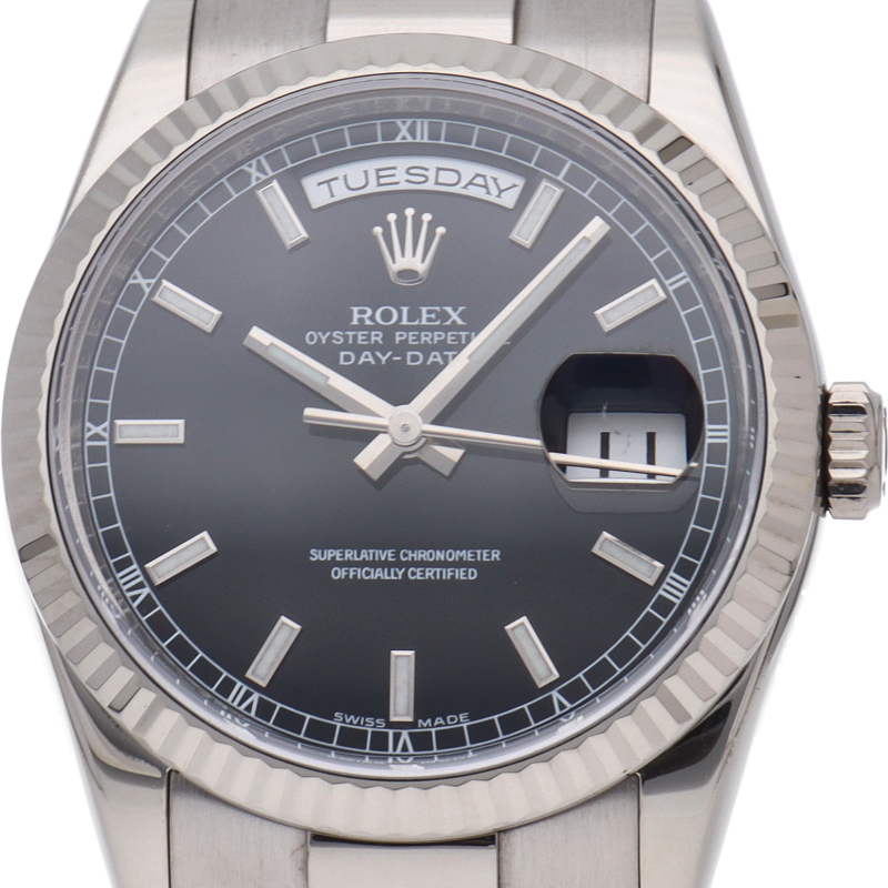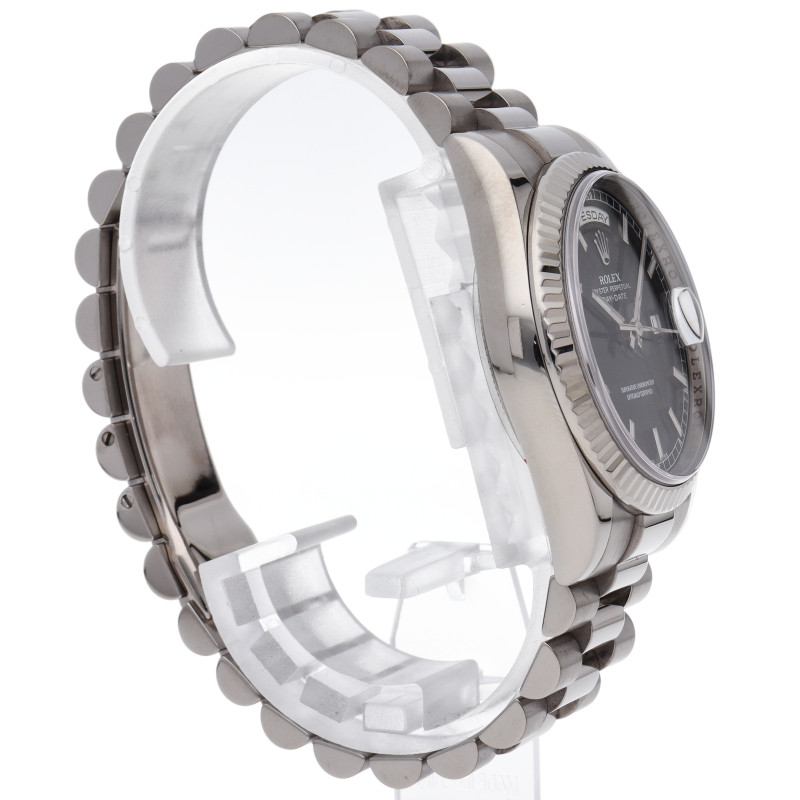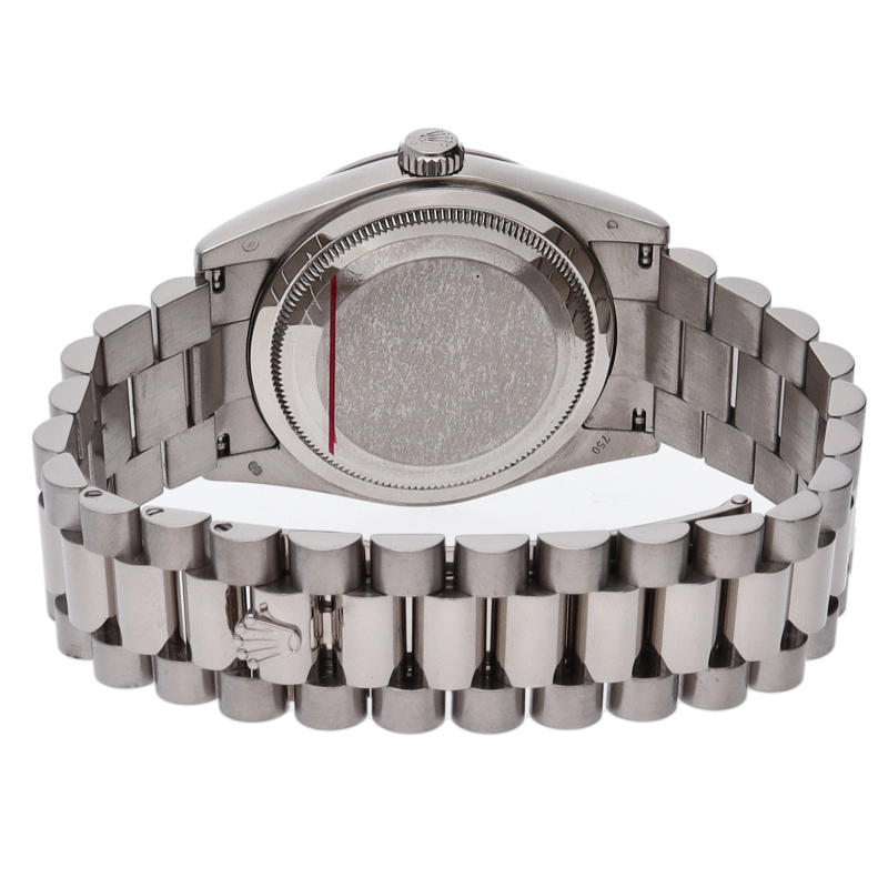 ロレックスのドレスウォッチの最高峰「デイデイト」。ホワイトゴールドを贅沢に使用したゴージャスさが人気のオススメの1本です。