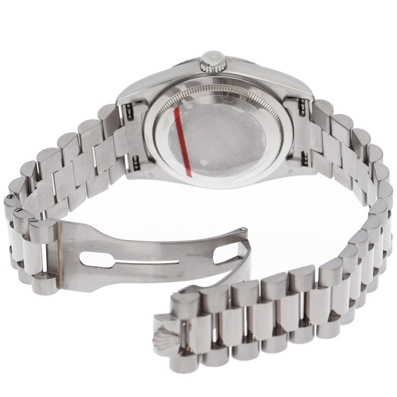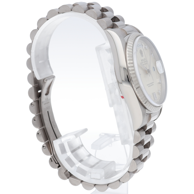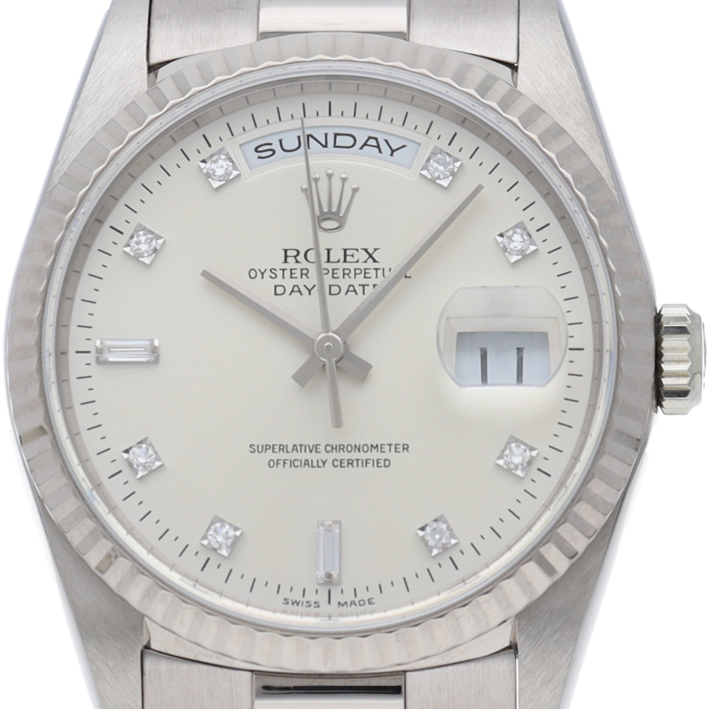 ロレックスのドレスウォッチの最高峰「デイデイト」。ホワイトゴールドを贅沢に使用したゴージャスさが人気のオススメの1本です。