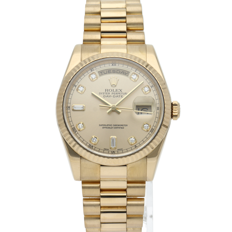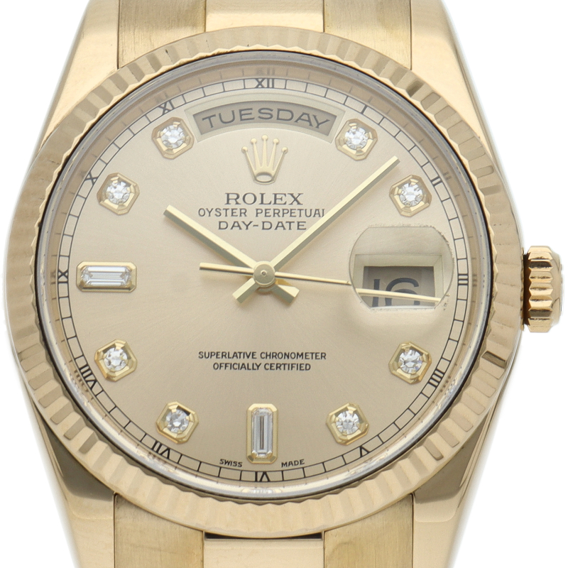 ロレックスのドレスウォッチの最高峰「デイデイト」。イエローゴールドを贅沢に使用したゴージャスさが人気の1本。10Pダイヤモンド仕様。