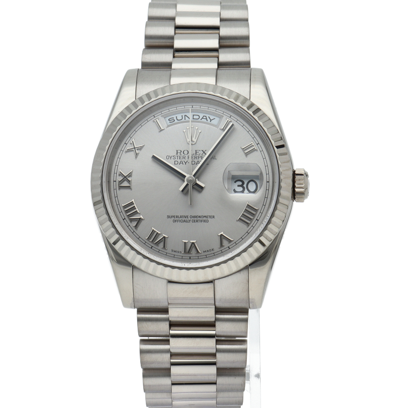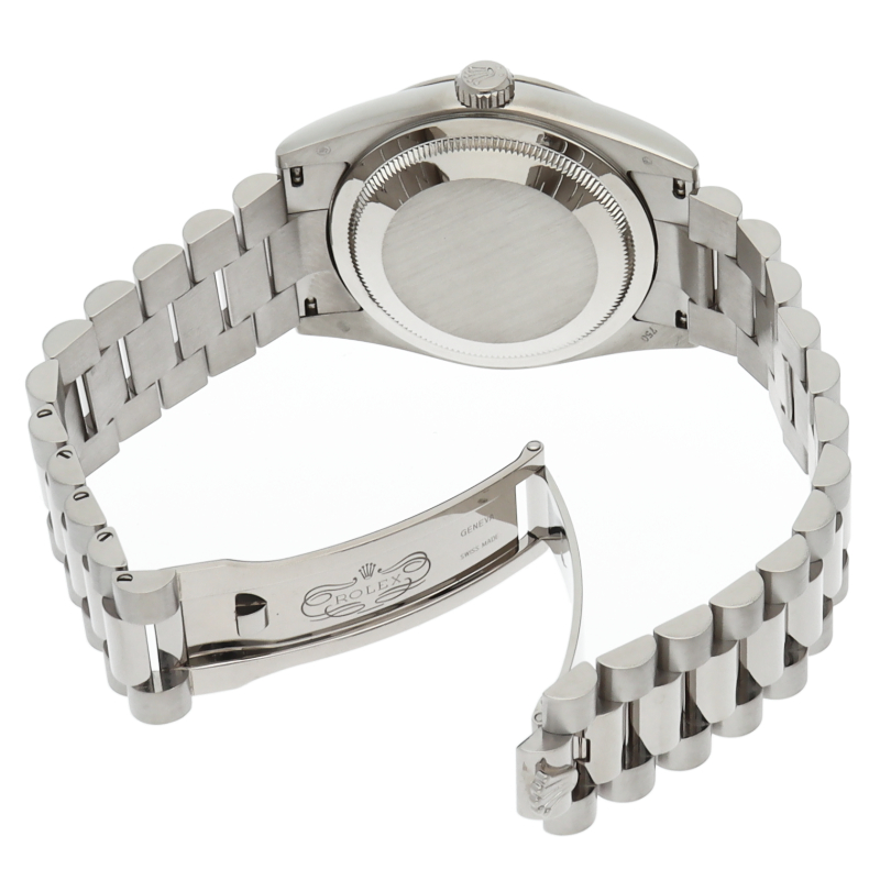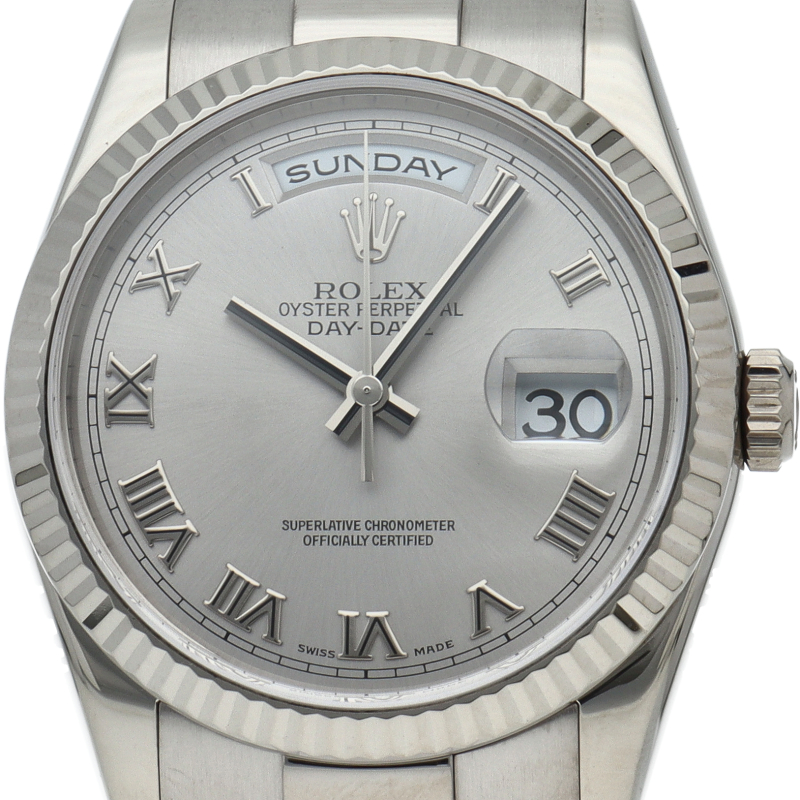 ロレックスのドレスウォッチの最高峰「デイデイト」。ホワイトゴールドを贅沢に使用したゴージャスさが人気のオススメの1本です。