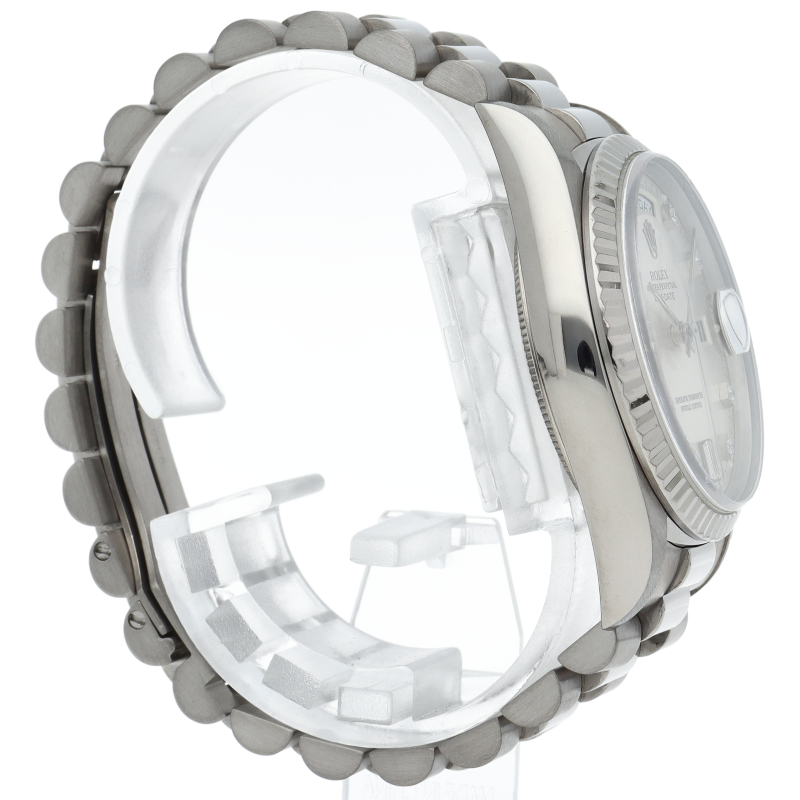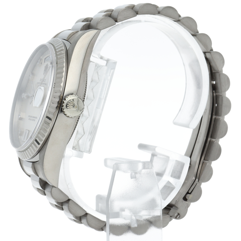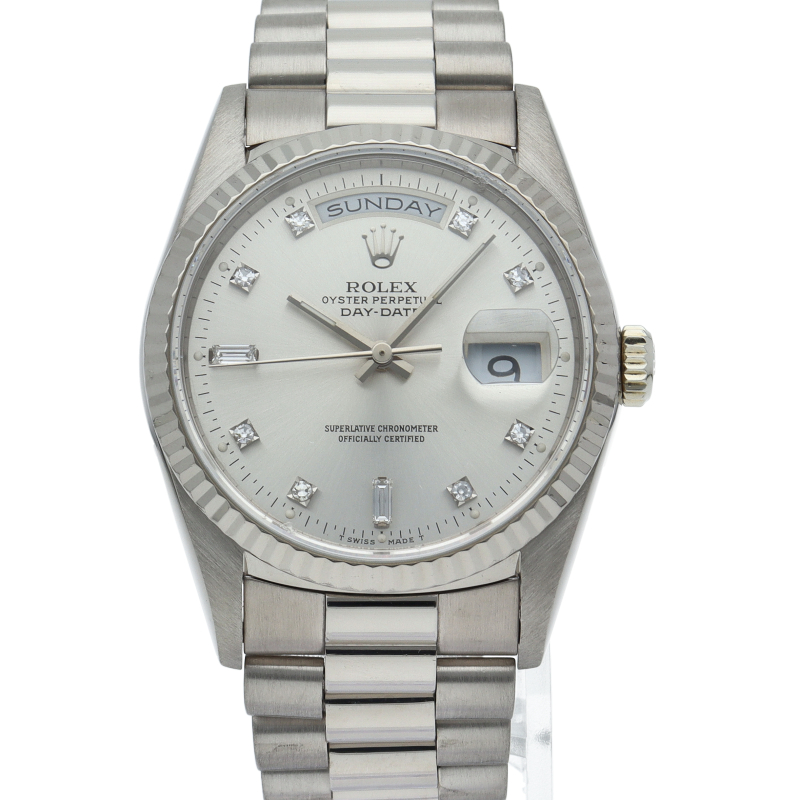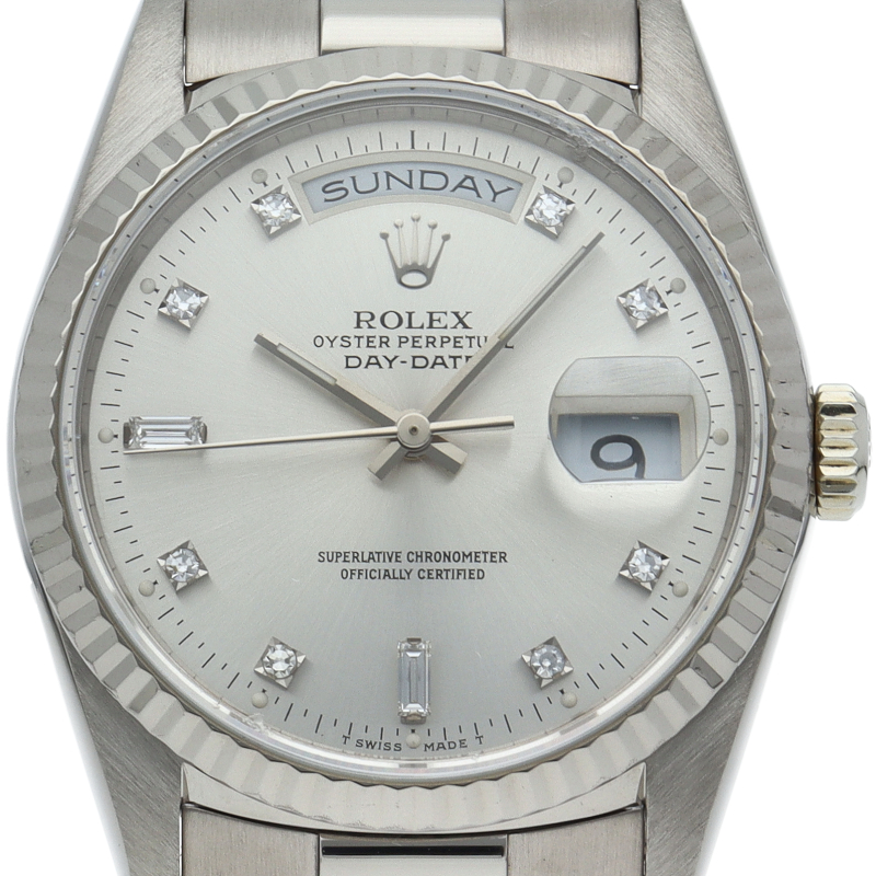 ロレックスのドレスウォッチの最高峰「デイデイト」。ホワイトゴールドを贅沢に使用したゴージャスさが人気のオススメの1本です。