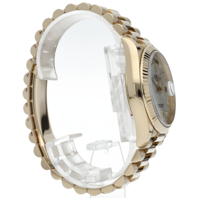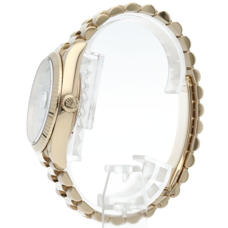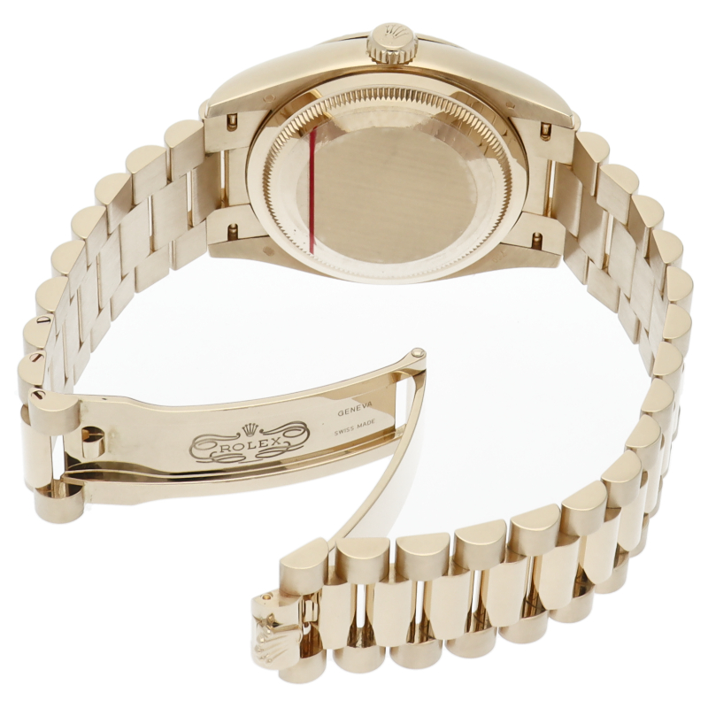 ロレックスのドレスウォッチの最高峰「デイデイト」。イエローゴールドを贅沢に使用したゴージャスさが人気の1本。10Pダイヤモンド仕様。