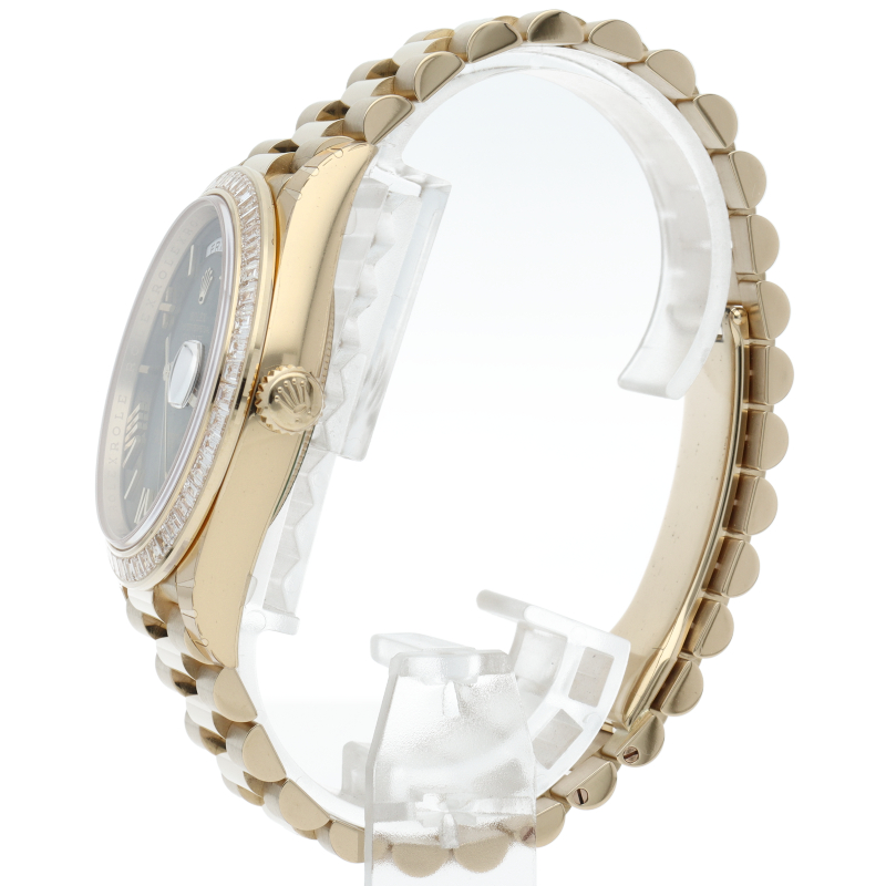 2015年に発売し、サイズアップしたデイデイト40。搭載されている自社製キャリバー3255は、耐磁性ブルーパラクロム・ヘアスプリングと高性能パラフレックスショック・アブソーバを搭載し、その精度基準はこれまでのクロノメーターの約2倍に設定され、ケーシング後の日差は-2~+2秒で調整されています。