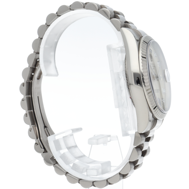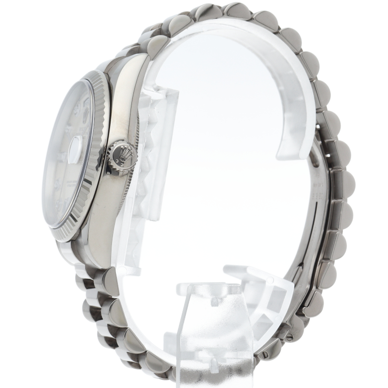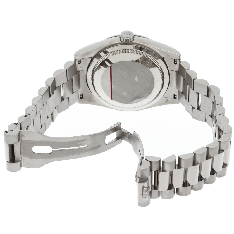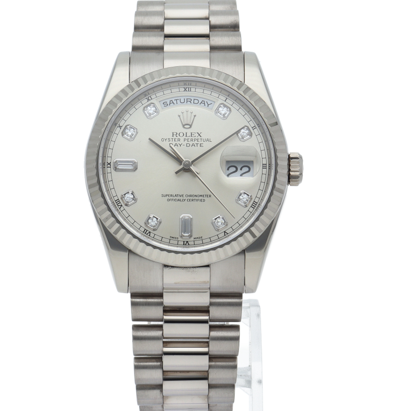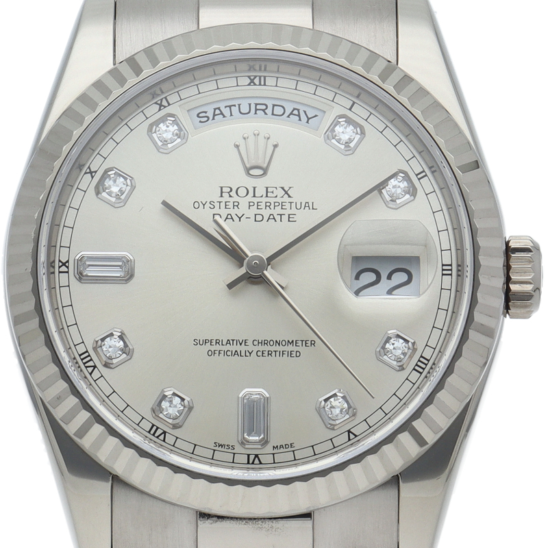 ロレックスのドレスウォッチの最高峰「デイデイト」。ホワイトゴールドを贅沢に使用したゴージャスさが人気のオススメの1本です。