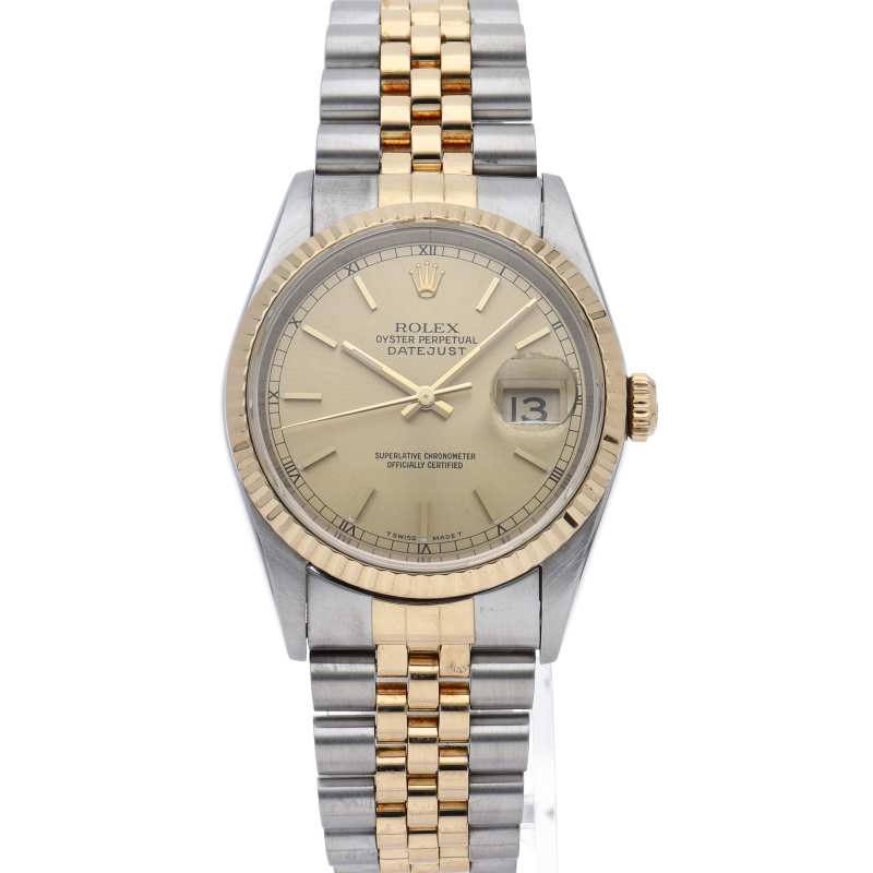 ロレックスのドレスウォッチの王道「デイトジャスト」。イエローゴールドとステンレスの組み合わせが上品で高級感を感じさせる1本です。