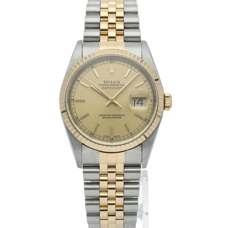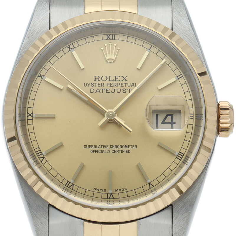 ロレックスのドレスウォッチの王道「デイトジャスト」。イエローゴールドとステンレスの組み合わせが上品で高級感を感じさせる1本です。
