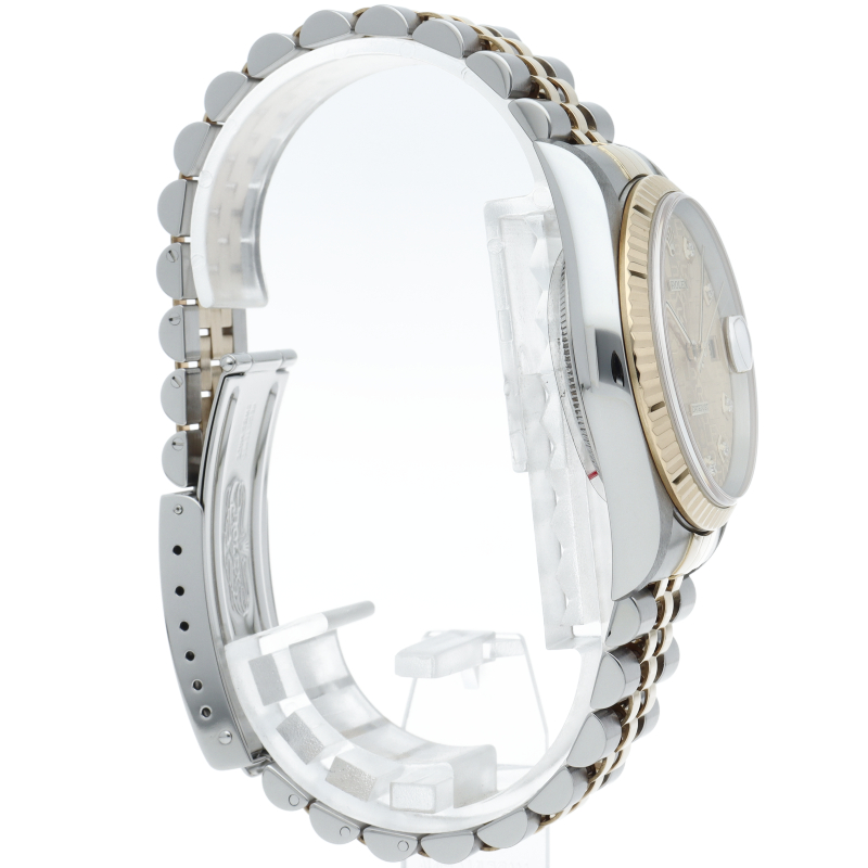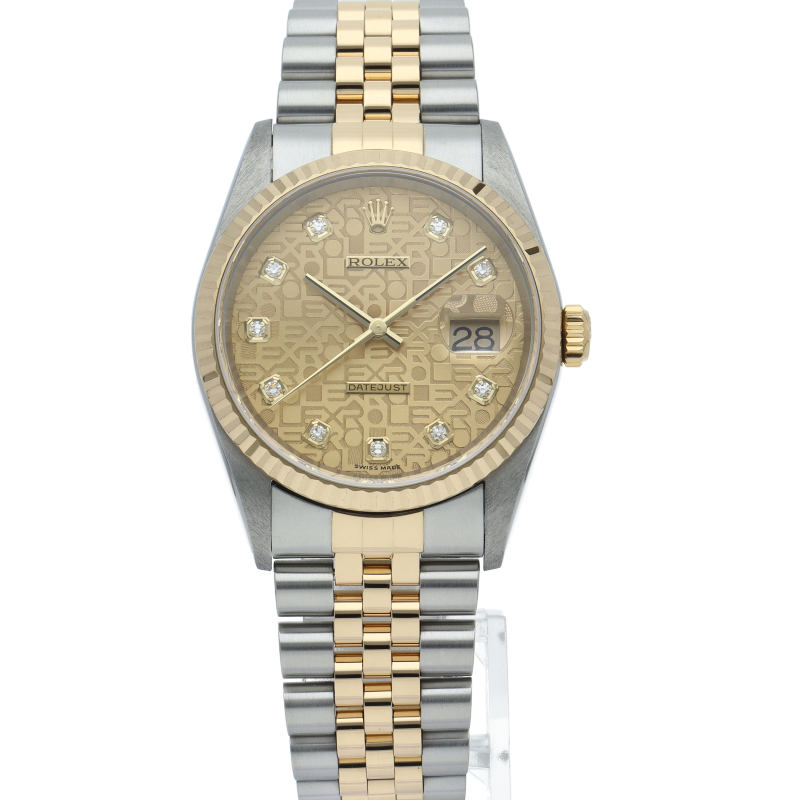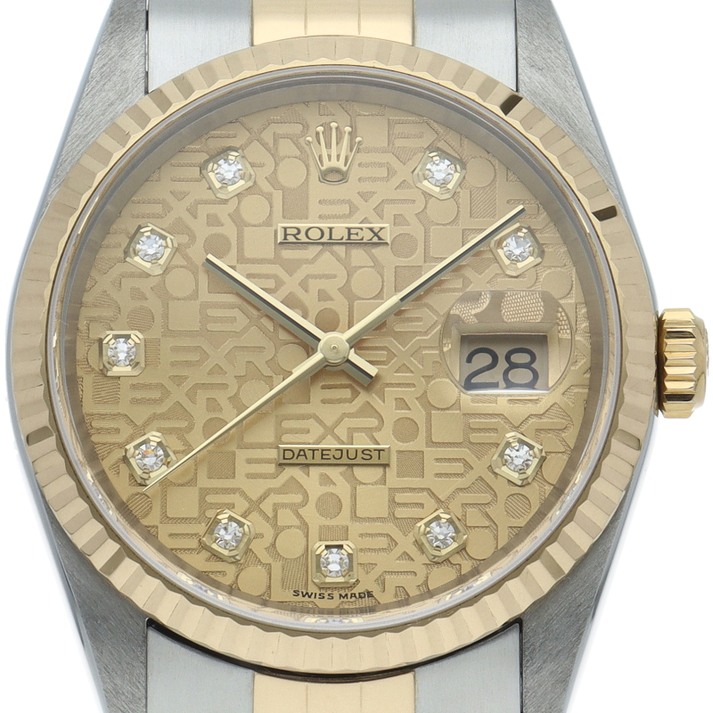 ロレックスのドレスウォッチで幅広い年齢層に愛されている「デイトジャスト」。イエローゴールドとステンレスのコンビ仕様に10Pダイヤが施されております。
