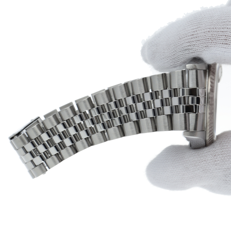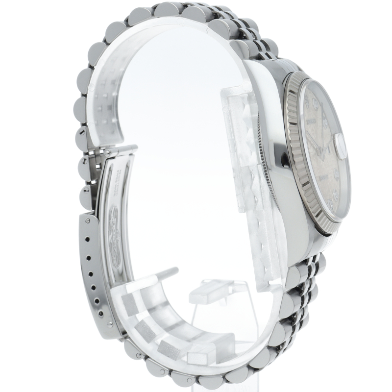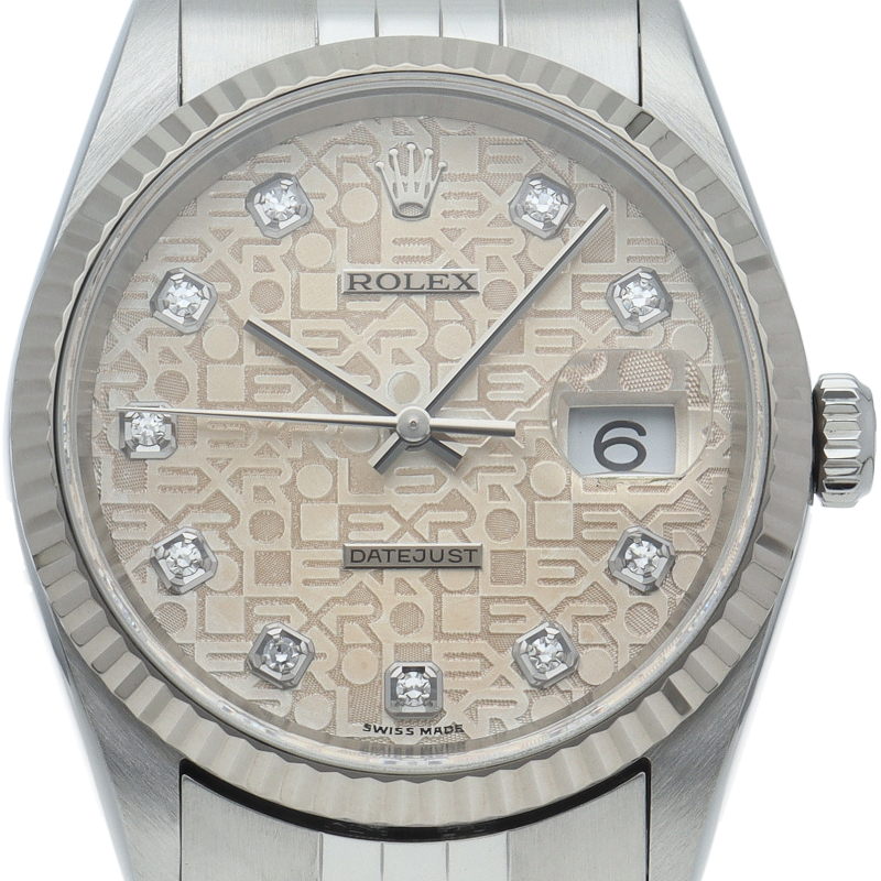 ロレックスの王道「デイトジャスト」Ref.16234G。18Kホワイトゴールドベゼルの鋭い輝きに加え、インデックスに10粒のダイヤモンドを配したラグジュアリーな仕様です。名機Cal.3135を搭載し実用性も抜群。完成されたデザインは色褪せず、腕元に知的なステータスを与える永遠のロングセラーモデルです。