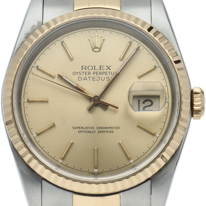 ロレックスのドレスウォッチの王道「デイトジャスト」。イエローゴールドとステンレスの組み合わせが上品で高級感を感じさせる1本です。