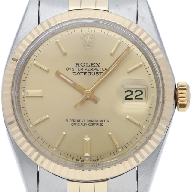 ロレックスドレスウォッチの王道「デイトジャスト」。ホワイトゴールドとステンレスの組み合わせが高級感を感じさせる1本です。プラスチック風防仕様。1601/3。