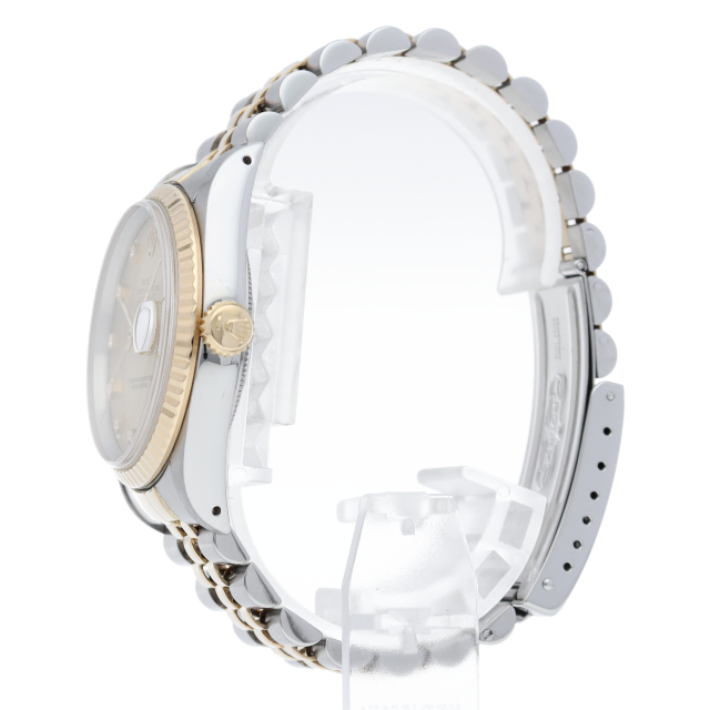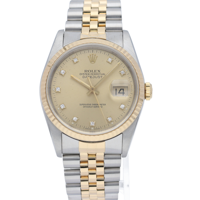 ロレックスのドレスウォッチで幅広い年齢層に愛されている「デイトジャスト」。イエローゴールドとステンレスのコンビ仕様に10Pダイヤが施されております。