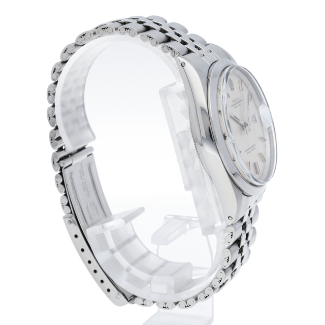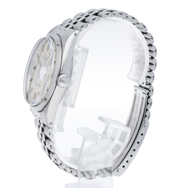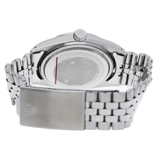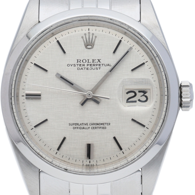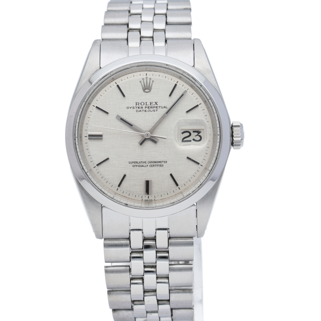 ロレックスドレスウォッチの王道「デイトジャスト」。デイトジャストのスムースベゼルは珍しいモデルです。プラスチック風防仕様。モザイク文字盤。