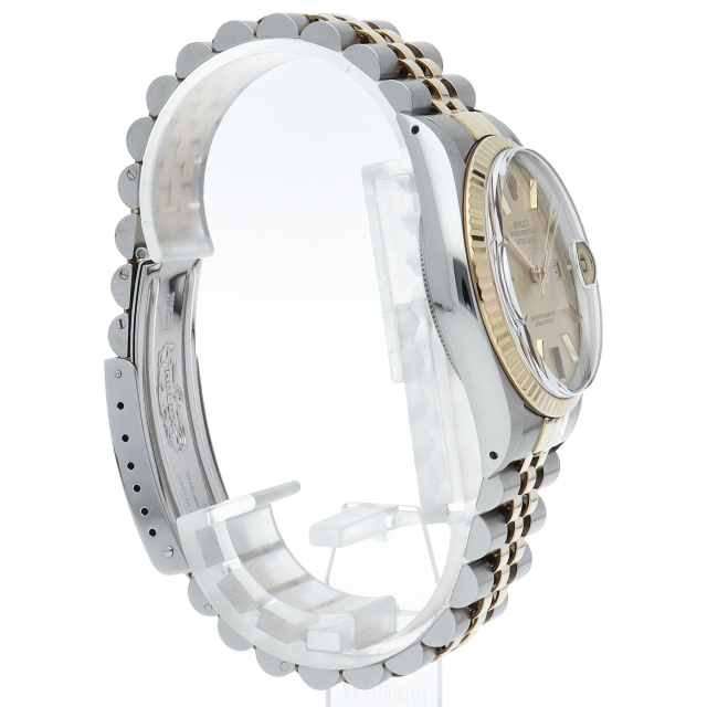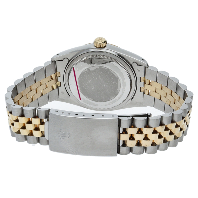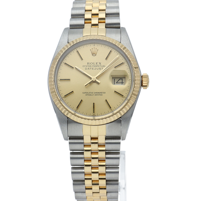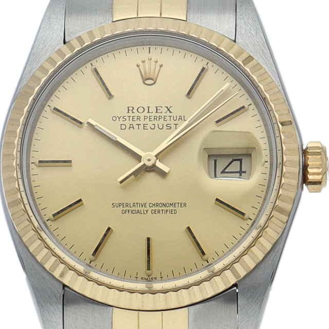 ロレックスドレスウォッチの王道「デイトジャスト」。イエローゴールドとステンレスの組み合わせが高級感を感じさせる1本です。プラスチック風防仕様。