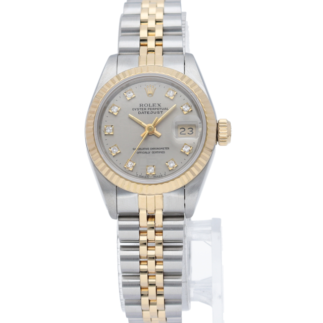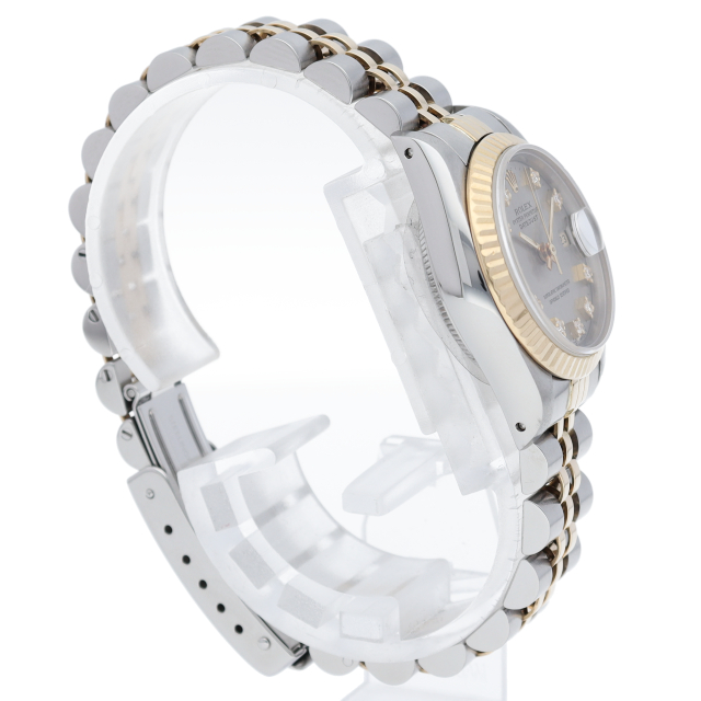 ロレックスのドレスウォッチで幅広い年齢層に愛されているデイトジャスト。イエローゴールドとステンレスのコンビ仕様に10Pダイヤが施され豪華です。
