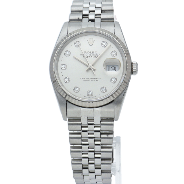ロレックスのドレスウォッチで幅広い年齢層に愛されている「デイトジャスト」。ホワイトゴールドとステンレスのコンビ仕様に10Pダイヤが施されております。
