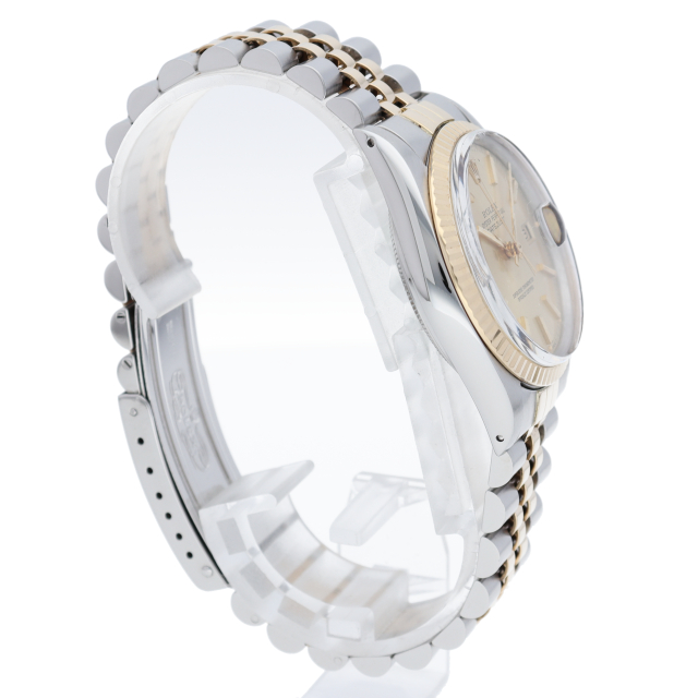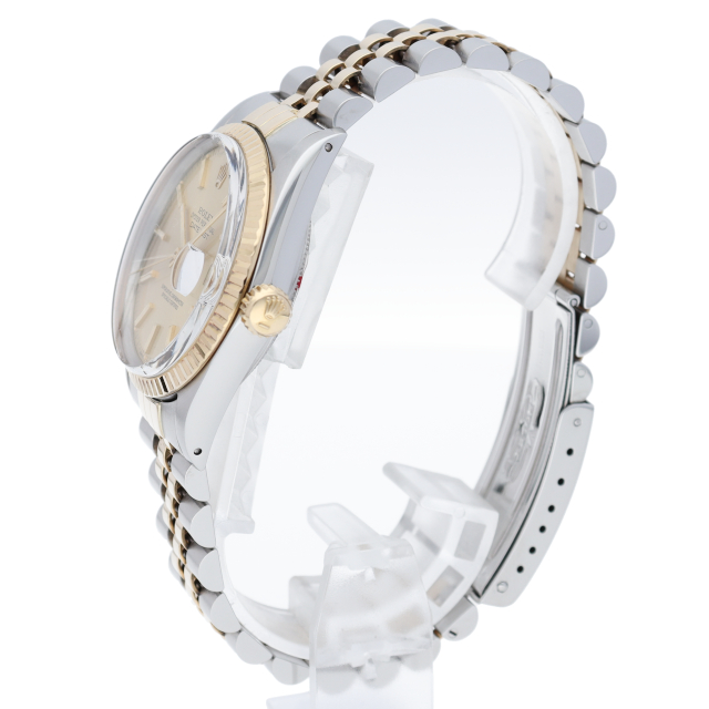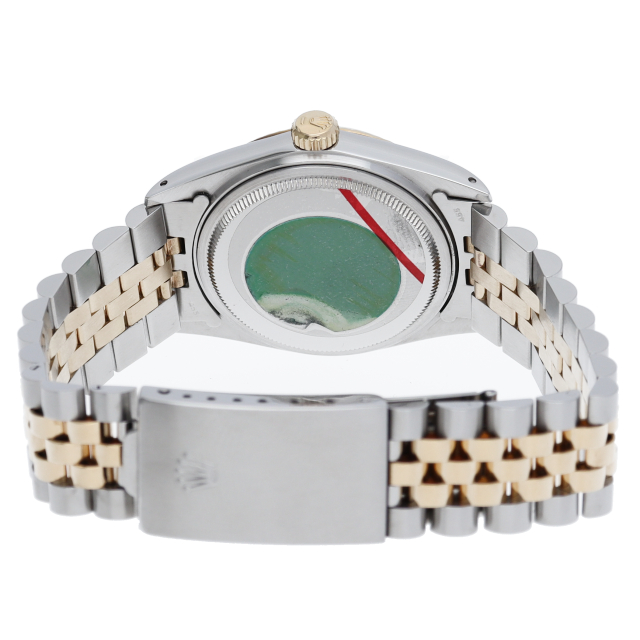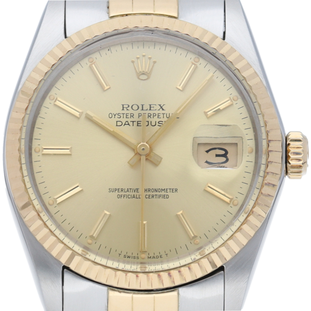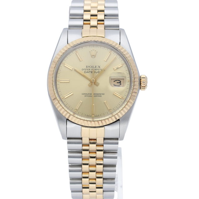 ロレックスドレスウォッチの王道「デイトジャスト」。イエローゴールドとステンレスの組み合わせが高級感を感じさせる1本です。プラスチック風防仕様。