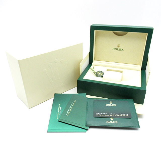 新品。ルーレット刻印。人気のミントグリーン文字盤。ランダム番。2010年以降の生産。2023年3月の購入品で以後5年間のメーカー保証が付いています。121.0g。