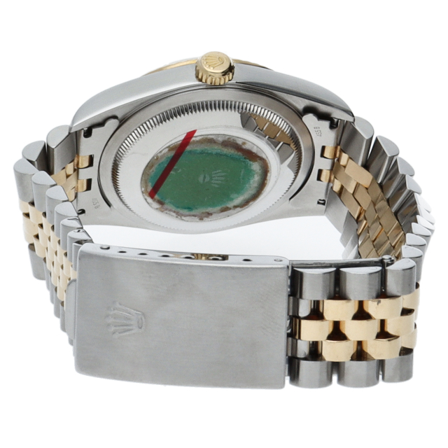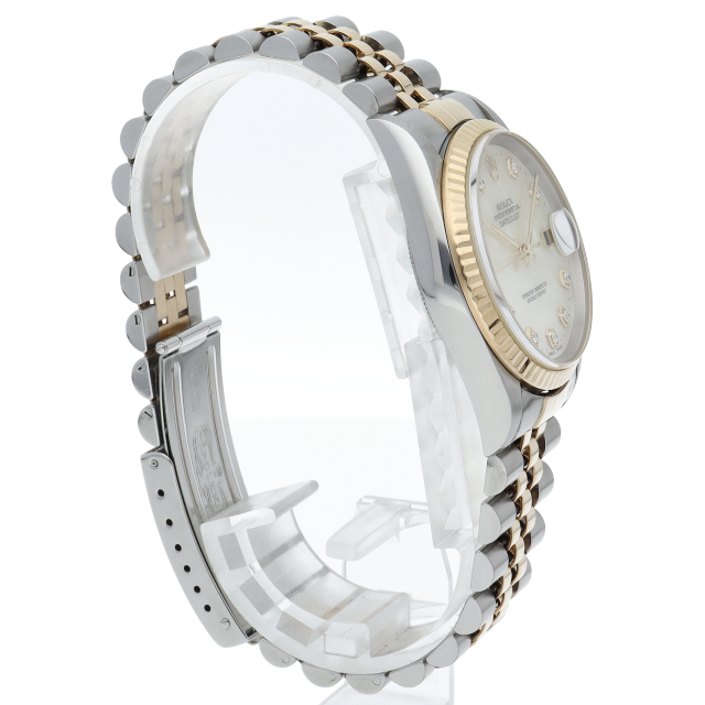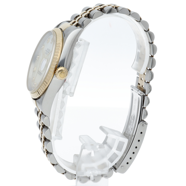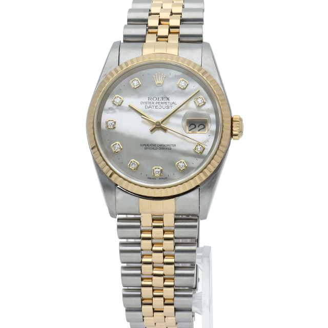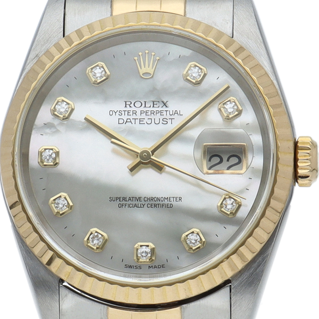 ロレックスのドレスウォッチで幅広い年齢層に愛されているデイトジャスト。イエローゴールドとステンレスのコンビ仕様です。文字盤にはシェルと10Pダイヤが施された高級感が更にアップした人気モデル。