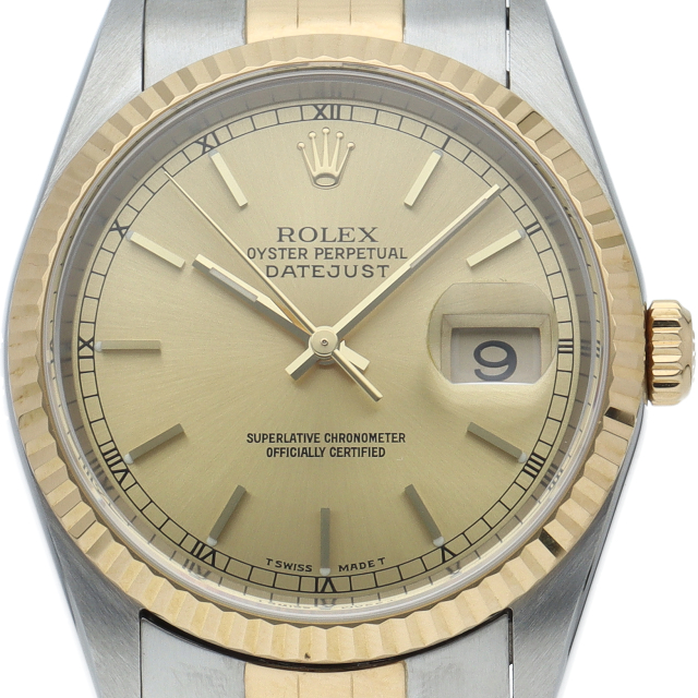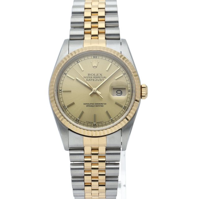 ロレックスのドレスウォッチの王道「デイトジャスト」。イエローゴールドとステンレスの組み合わせが上品で高級感を感じさせる1本です。
