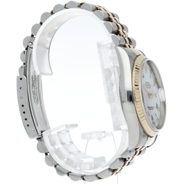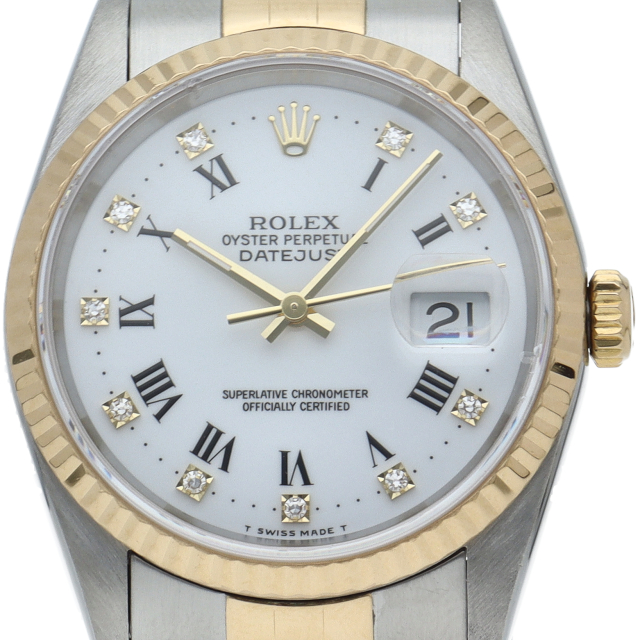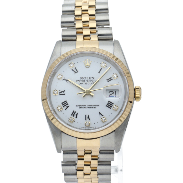 ロレックスのドレスウォッチで幅広い年齢層に愛されている「デイトジャスト」。イエローゴールドとステンレスのコンビ仕様に10Pダイヤが施されております。